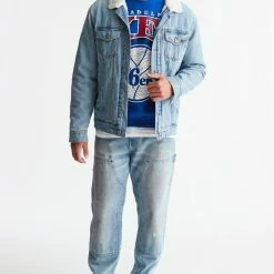 Best Sale 😍 Men’s Mitchell & Ness NBA Stretch Philadelphia 76ers Crew Neck Sweatshirt Blue 🛒