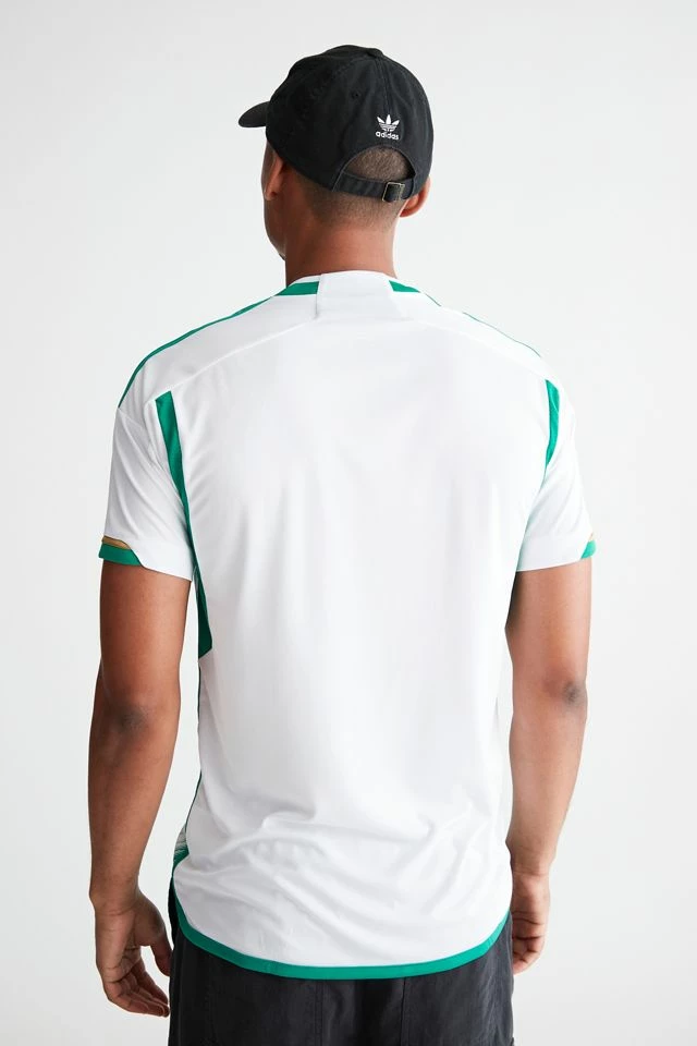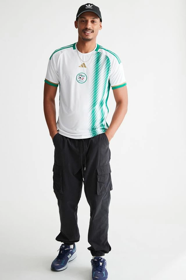 Short sleeve jersey t-shirt with an allover pattern and team logo at the front. Features classic 3-stripe accents at the sleeves. Crew neck style with articulated sleeve seam detailing for an athletic style.