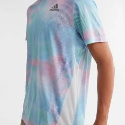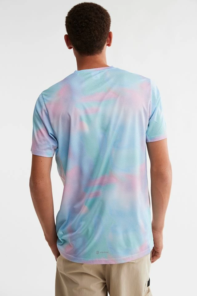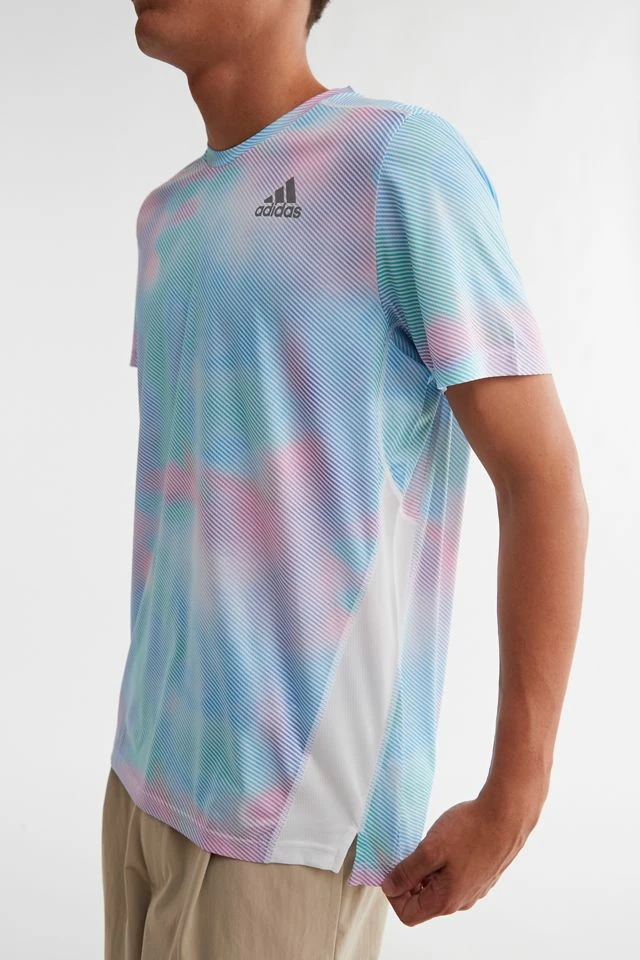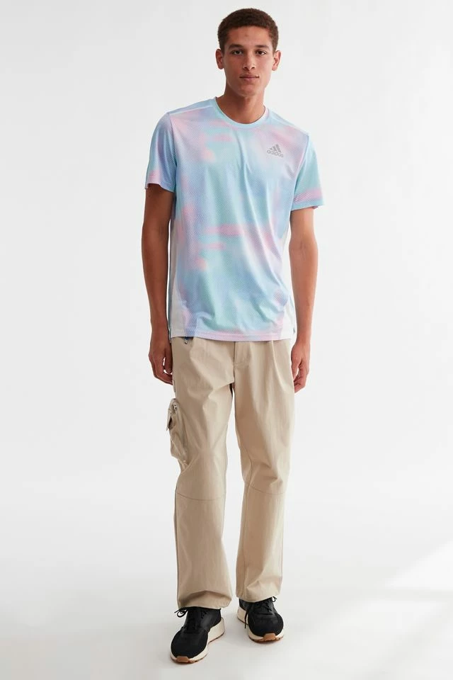 Tee by adidas with a tie-dye wash effect. Cotton t-shirt in a standard fit with a logo accent at the left chest. Short sleeve style with a ribbed knit crew neck.