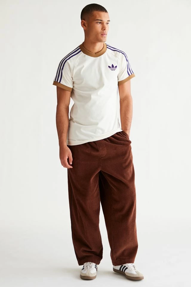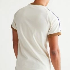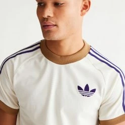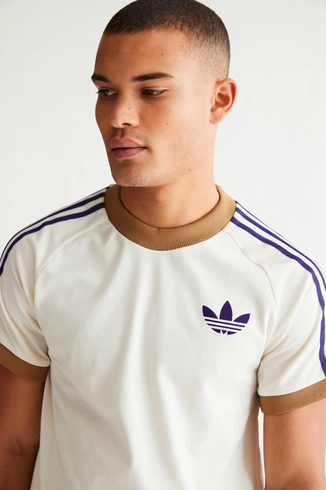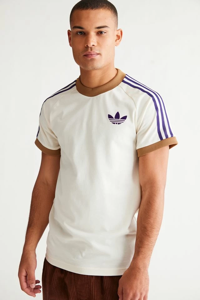 Retro style t-shirt by adidas. Features classic 3-stripe detailing at the shoulders and contrast ribbed knit trim detailing at the neck and sleeves. Topped with a logo accent at the left chest. Cotton jersey tee in a standard fit.