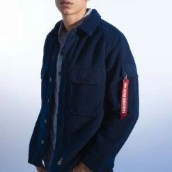 Button-down wool blend shirt by Alpha Industries. Boxy fit and topped with flap pockets. Includes a woven logo label and a classic “Remove Before Flight” ribbon at the sleeve.