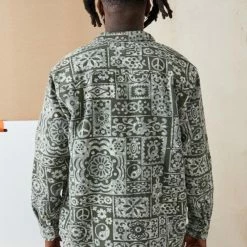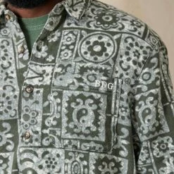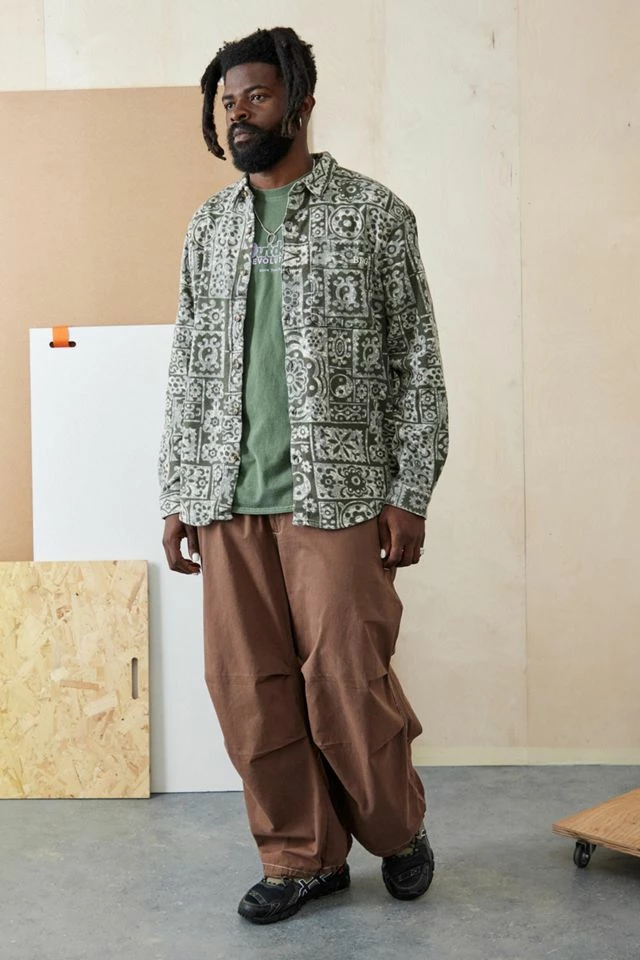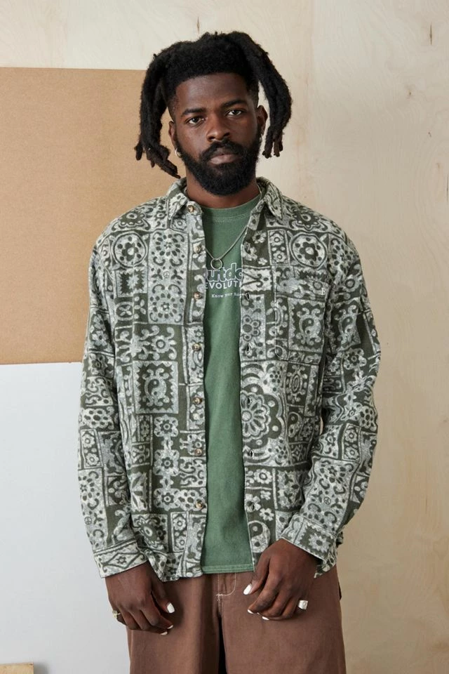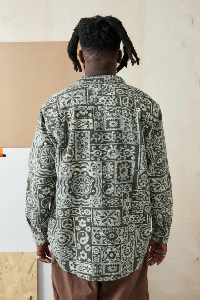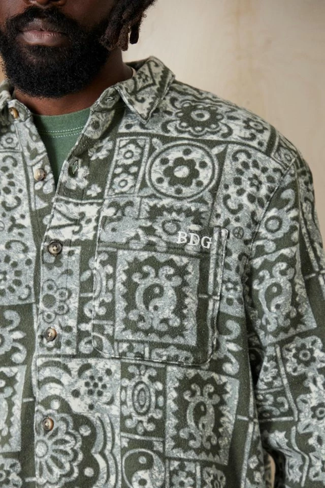 Update your wardrobe with this block print shirt by BDG. Features a spread collar, button-through placket, drop shoulders, long sleeves with button-up cuffs and a breast pocket. Complete with an embroidered logo to chest. Only at UO.