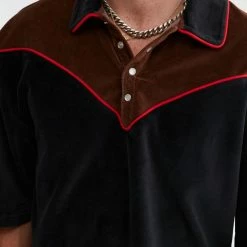 Short sleeve polo shirt by BDG with a western feel. Velour shirt fitted with contrast piping at the collar and yoke. Fitted with a partial button closure at the front. Urban Outfitters exclusive.