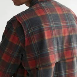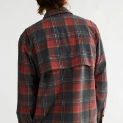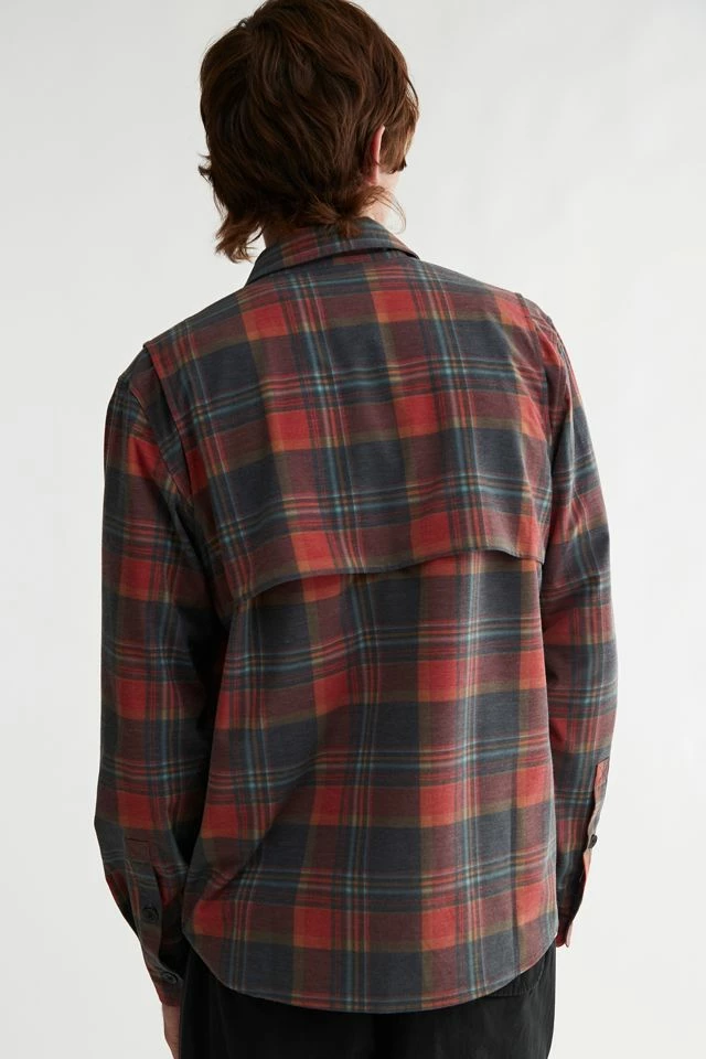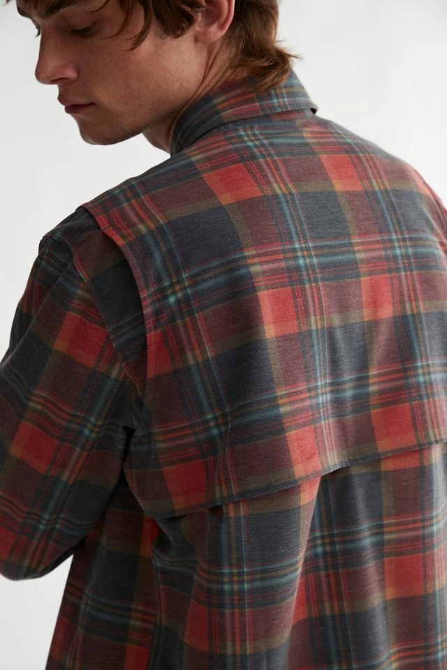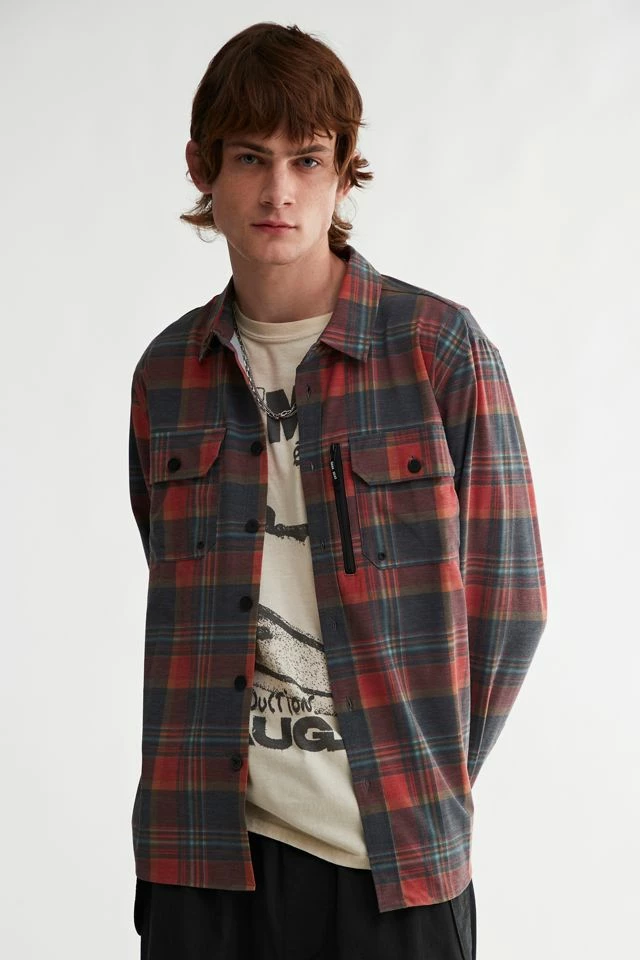 Plaid pattern flannel shirt by Dark Seas with a button-down front. Fitted with flap pockets at the chest and a tab collar.
