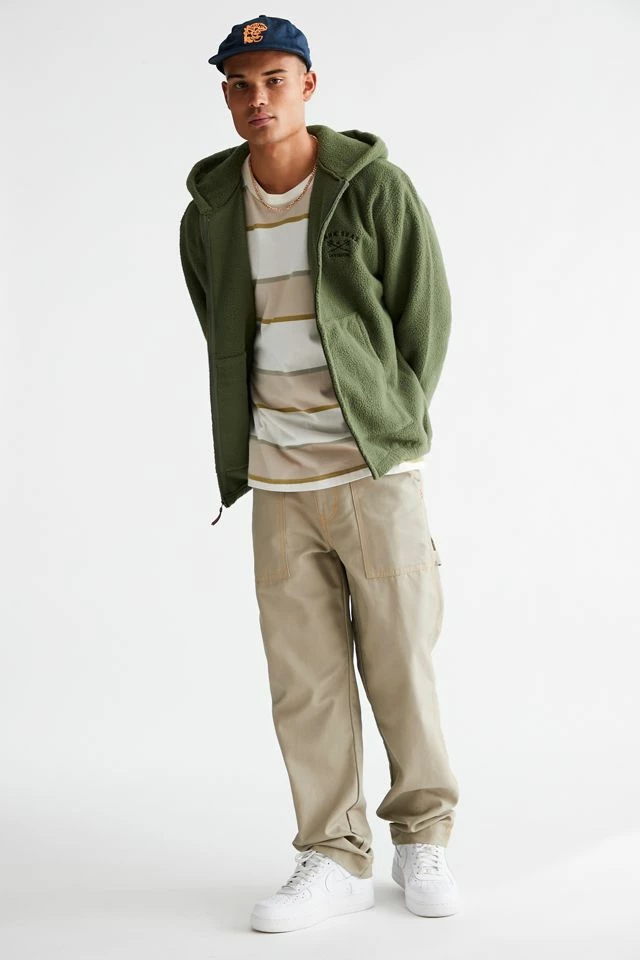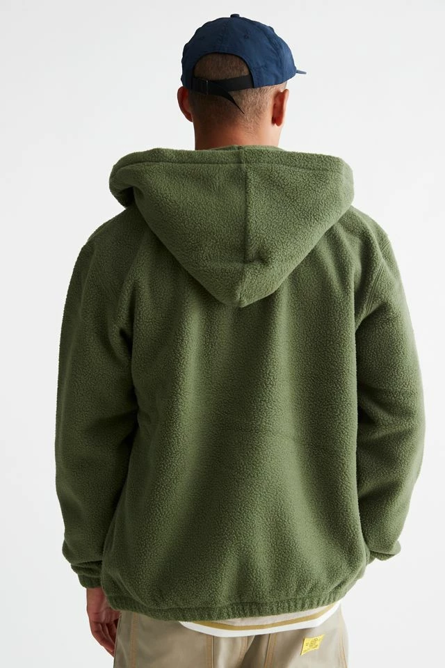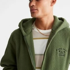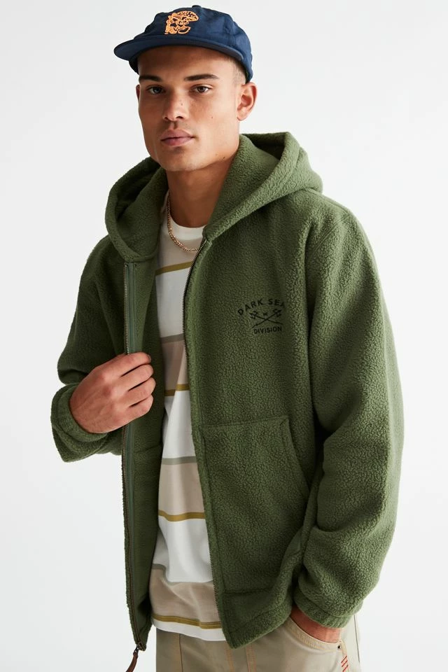 Fleece sweatshirt by Dark Seas with a full zip at the front and fitted with a hood. Includes embroidered text at the left chest. Pockets and the front and elastic trims.