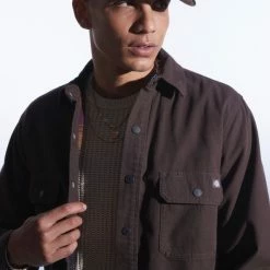 Duck canvas shirt jacket by Dickies with a flannel lining. Button-down front with flap pockets at the chest.