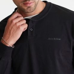 Classic Henley style long sleeve tee from Dickies. Cotton shirt with a crew neck and partial button closure. Topped with logo text at the left chest.