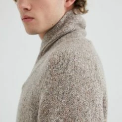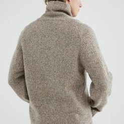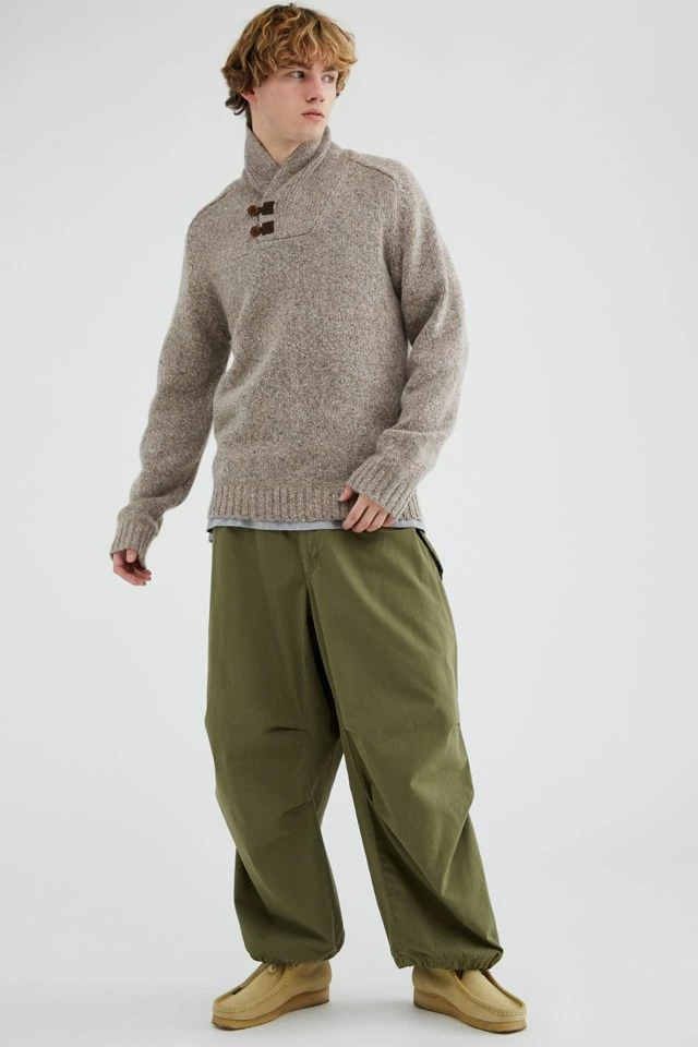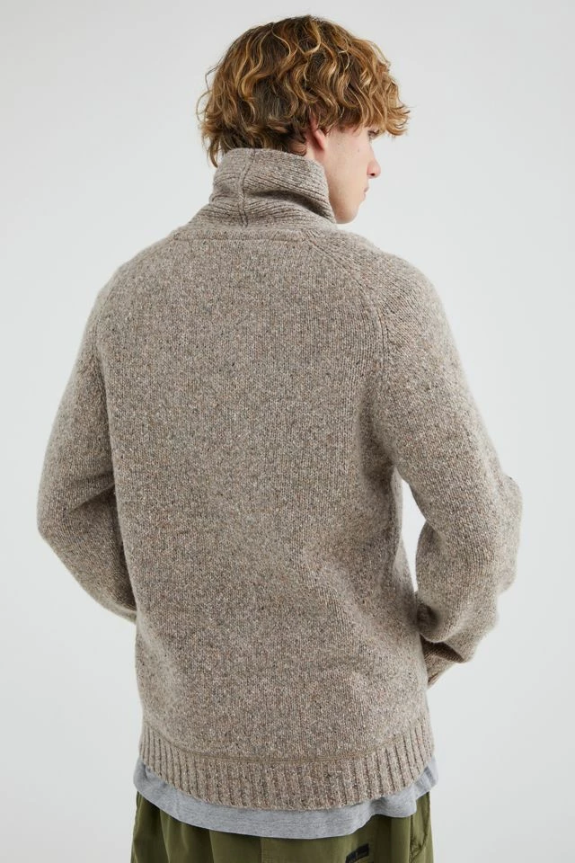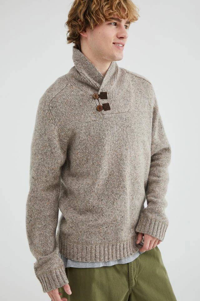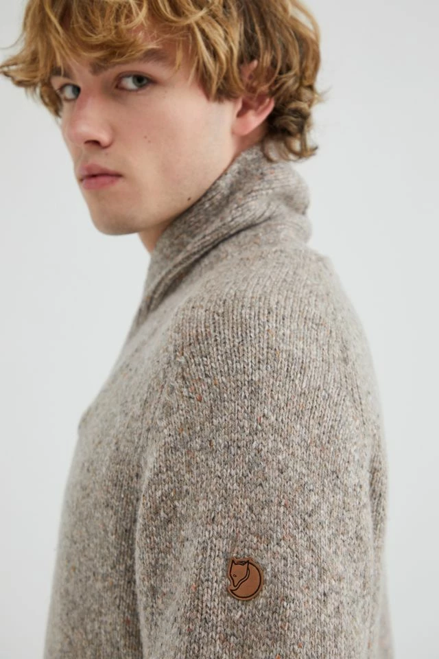 Pullover wool blend sweater by Fjallraven. Knit fabrication with a shawl style collar and button detailing at the neck. Fitted with ribbing trims.