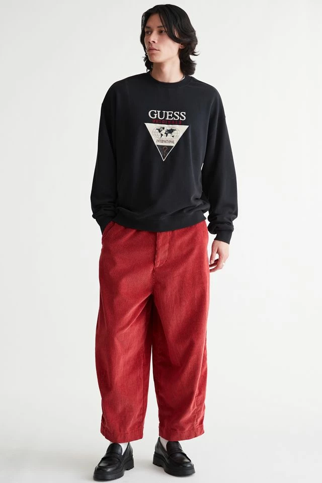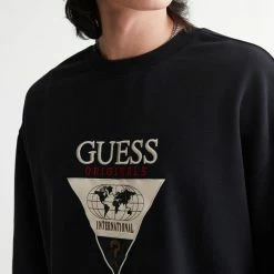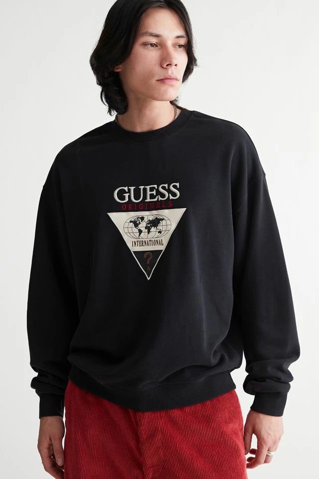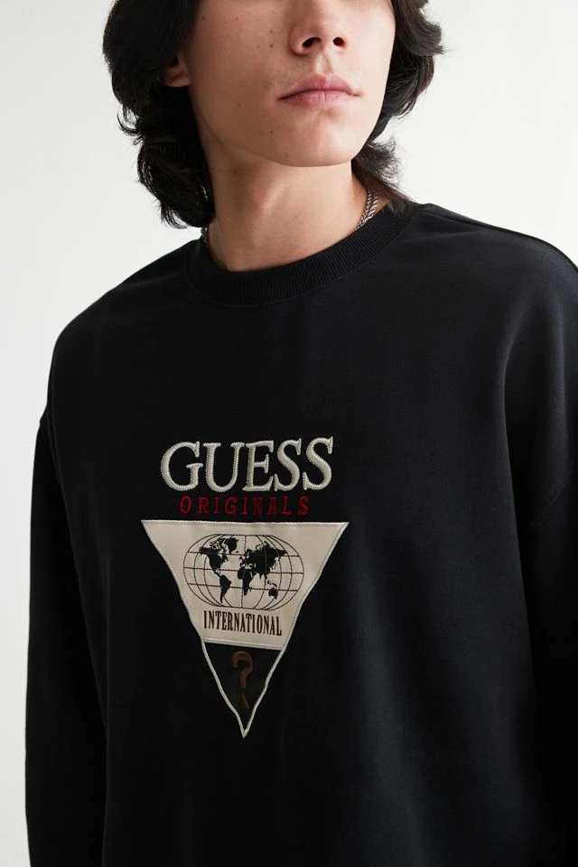 Logo applique sweatshirt by GUESS ORIGINALS. Pullover style with a crew neck and fitted with ribbed knit trims.