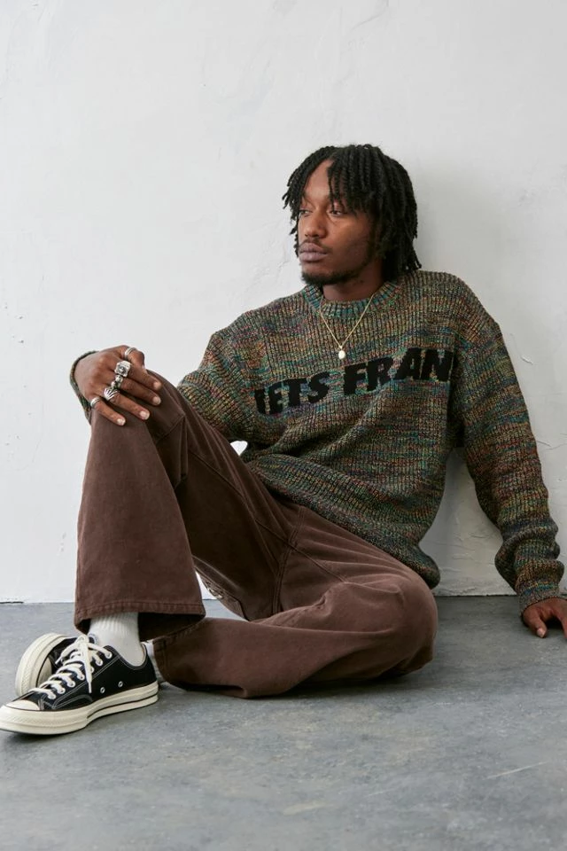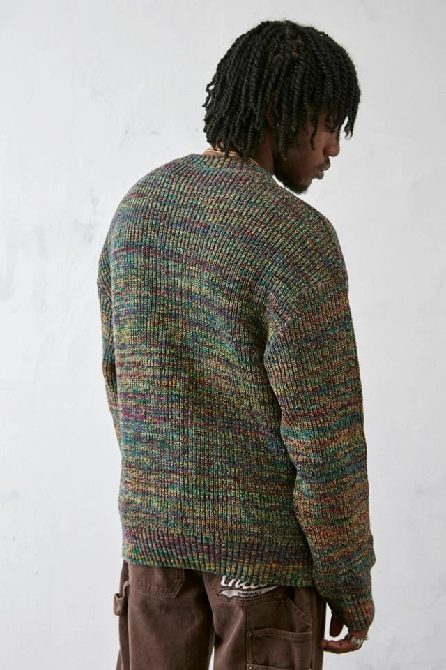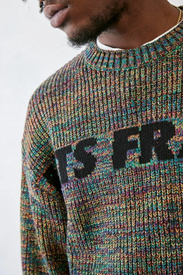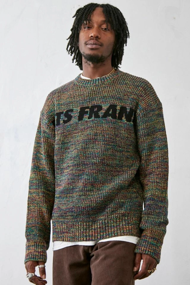 Stand-out logo sweater by iets frans… crafted from space-dye knit fabrication. Pullover style Ft. a crew neck, drop shoulders, long sleeves and ribbed trims, finished with a knitted logo motif to chest. Only at Urban Outfitters.