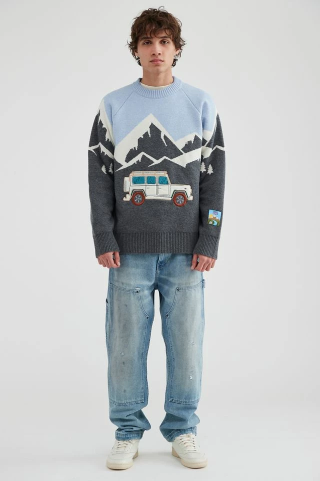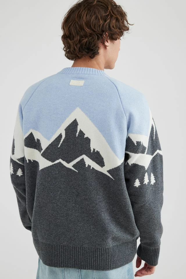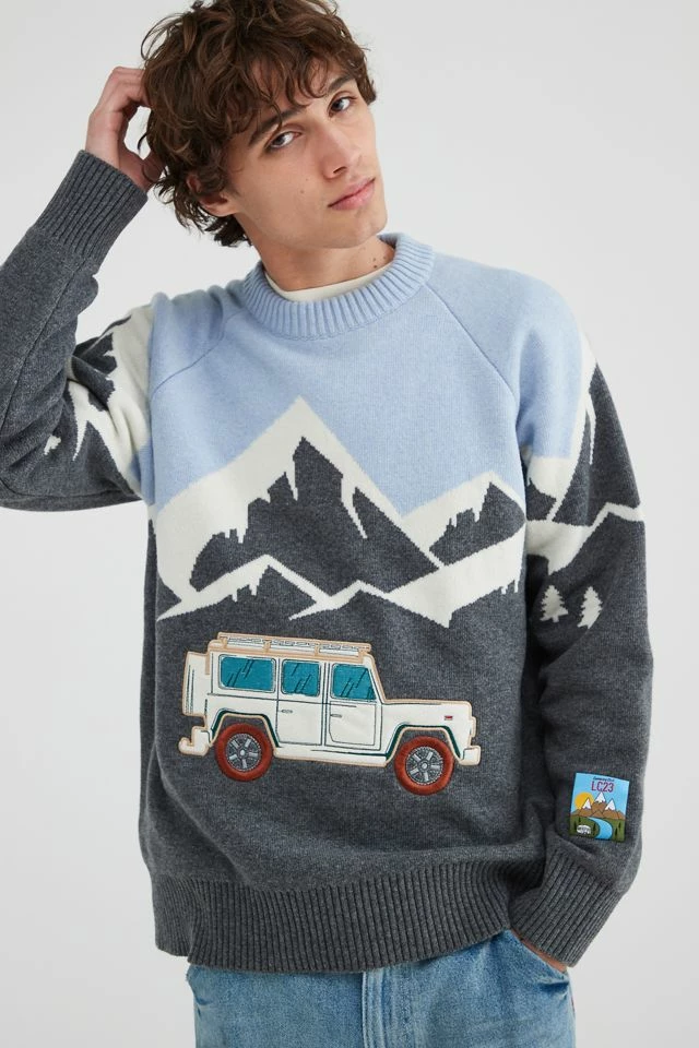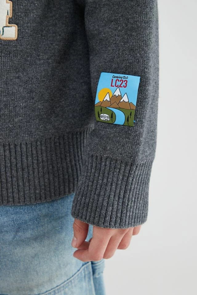 Patterned knit sweater by LC23. Pullover style with a crew neck and ribbed knit trims.