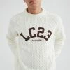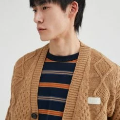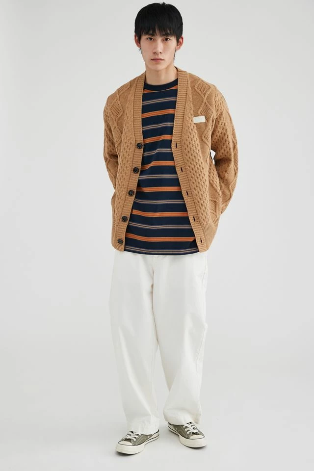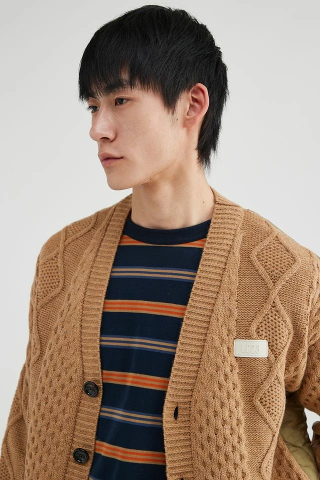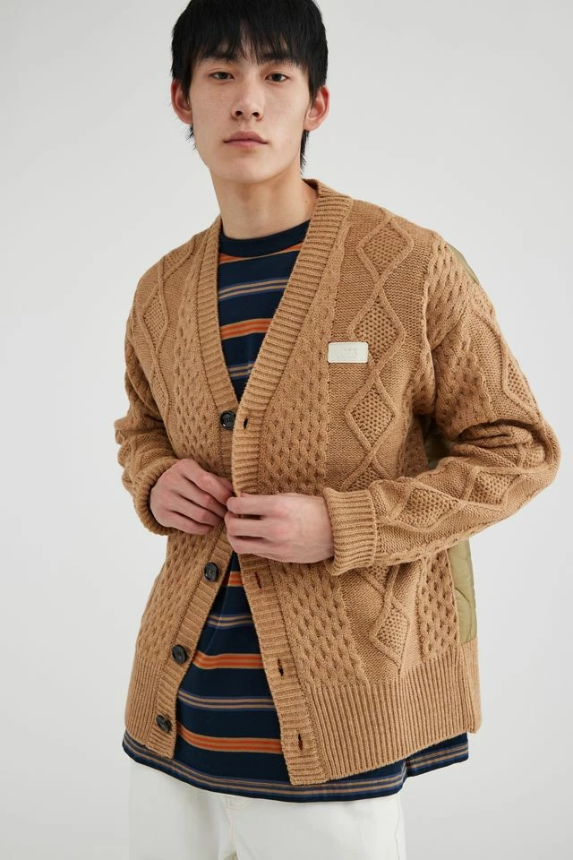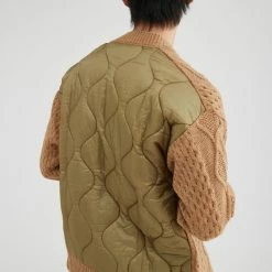 Quilted cardigan sweater by LC23. Knit fabrication with quilted nylon paneling at the back. Button-down style with ribbed knit trims.