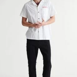 Short sleeve shirt by M/SF/T with graphics printed at the chest and back. Button-down cotton shirt with a left chest pocket and notched collar.