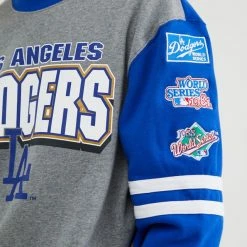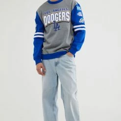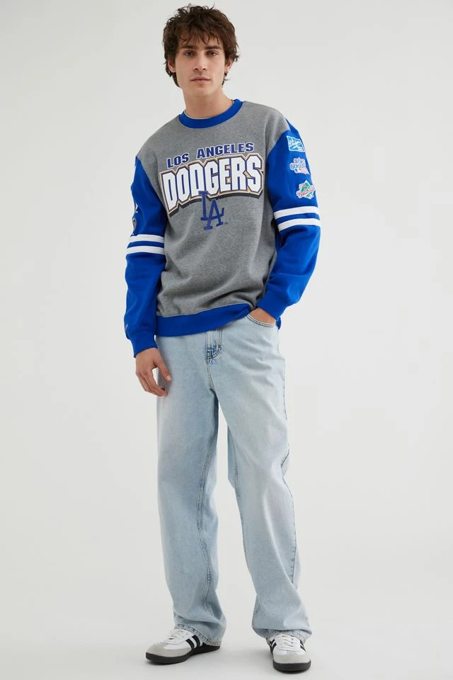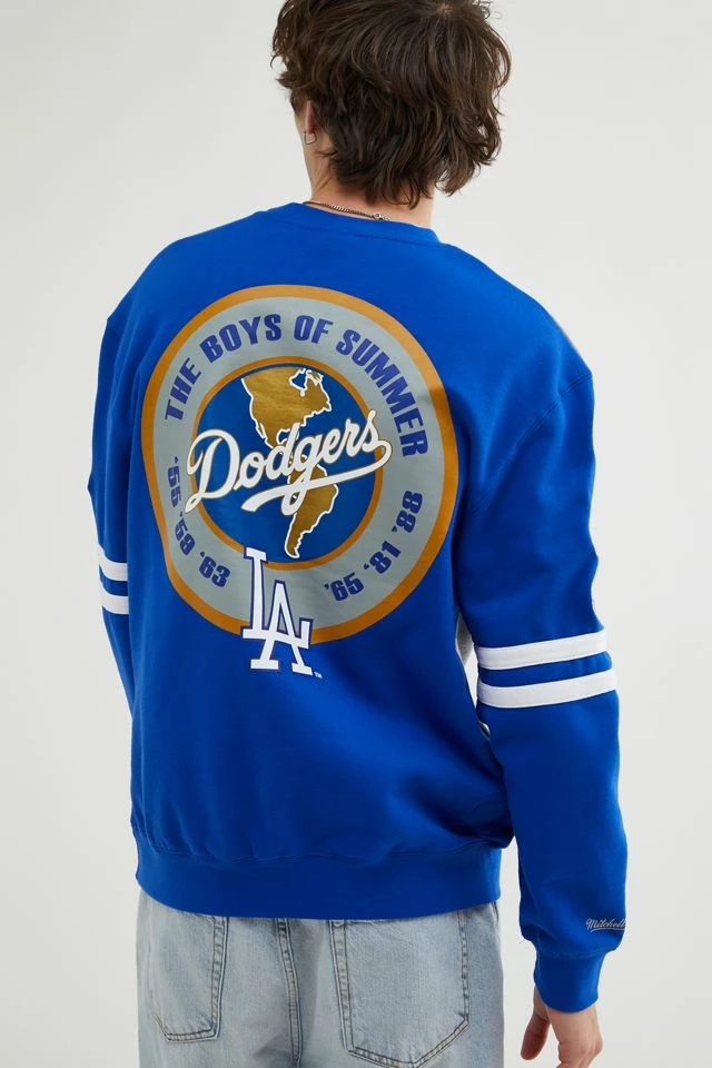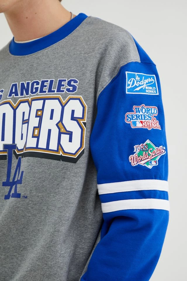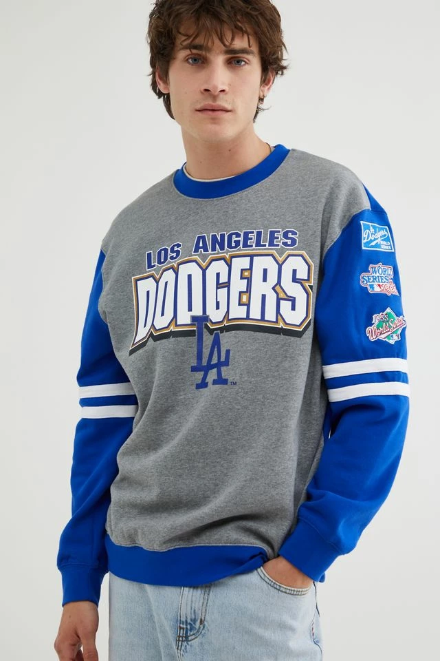 Los Angeles Dodgers sweatshirt by Mitchell & Ness. Features logo text printed at the front and patch accents at the contrast sleeves. Fitted with a crew neck and ribbed knit trims.