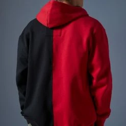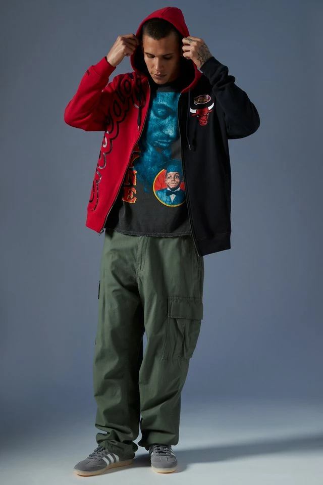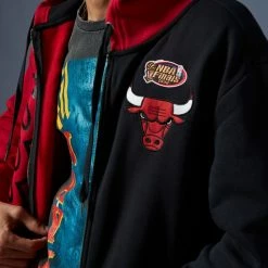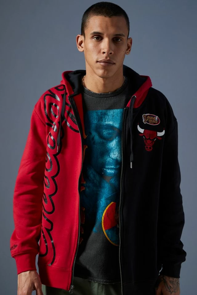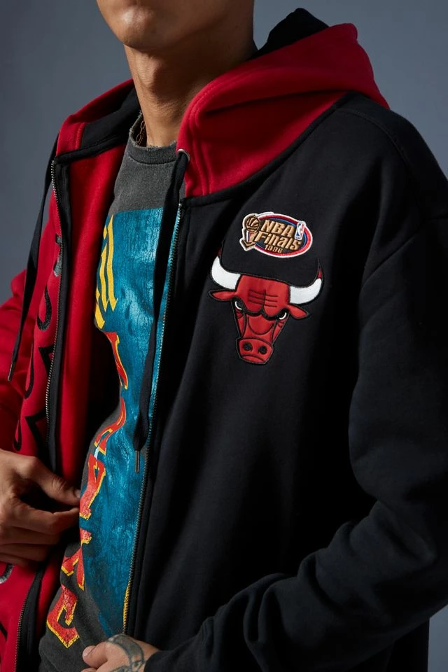 Two-tone hoodie by Mitchell & Ness topped with Chicago Bulls motifs. Cotton poly sweatshirt fitted with an adjustable hood, front pockets and ribbed knit trims.