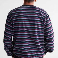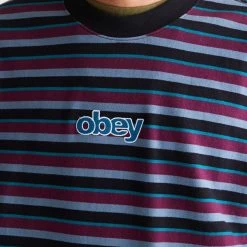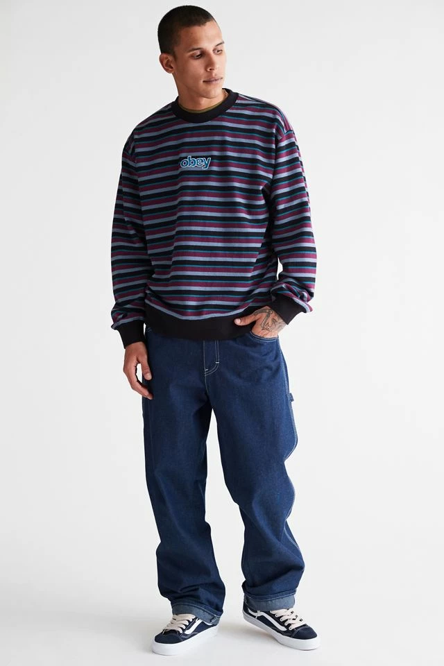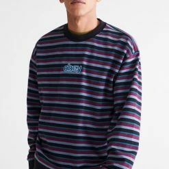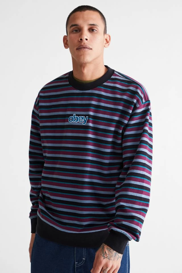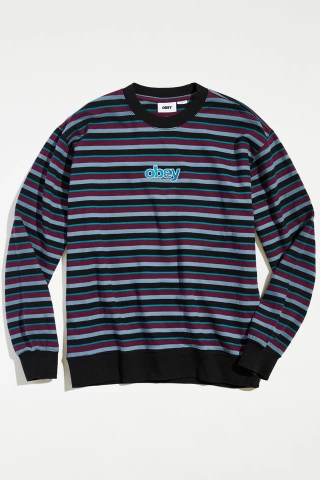 Stripe pattern crew neck sweatshirt by OBEY. Topped with embroidered logo text at the front. Pullover style with contrast ribbed knit trims.