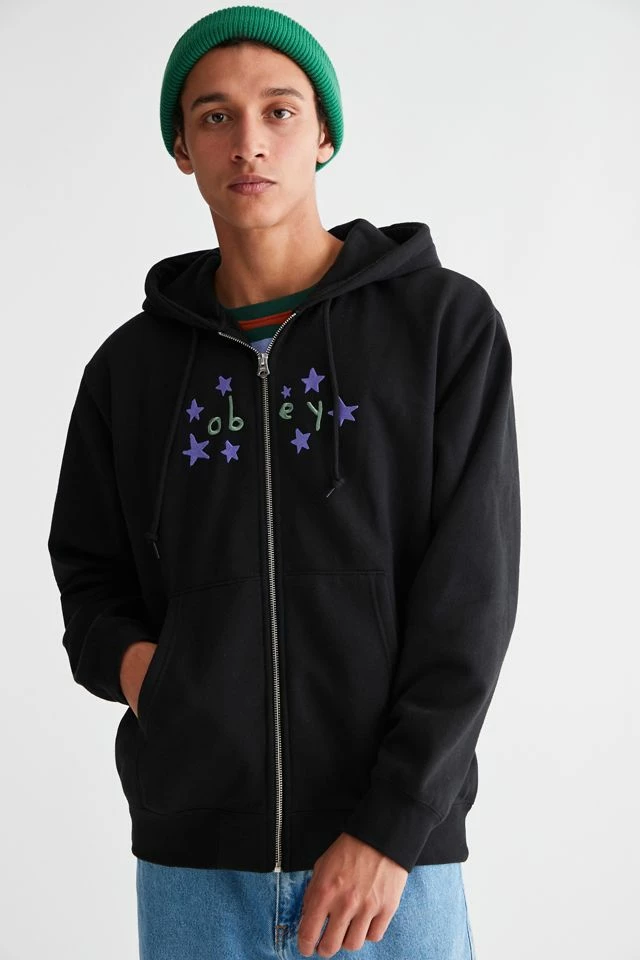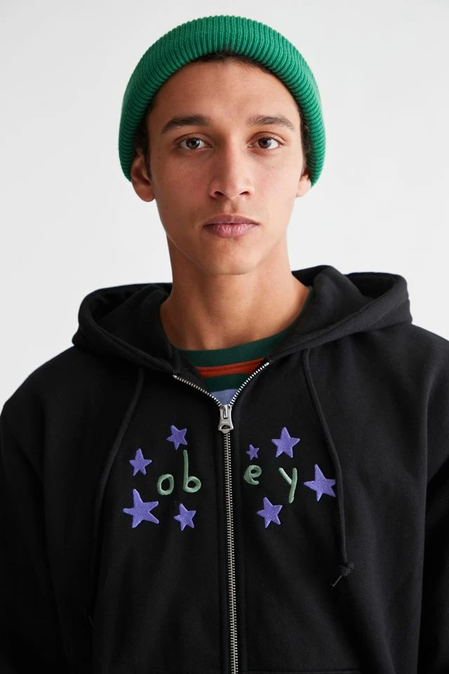 Embroidered hoodie from OBEY with a full zip closure at the front. Cotton poly blend with pockets and a hood. Fitted with ribbing trims.