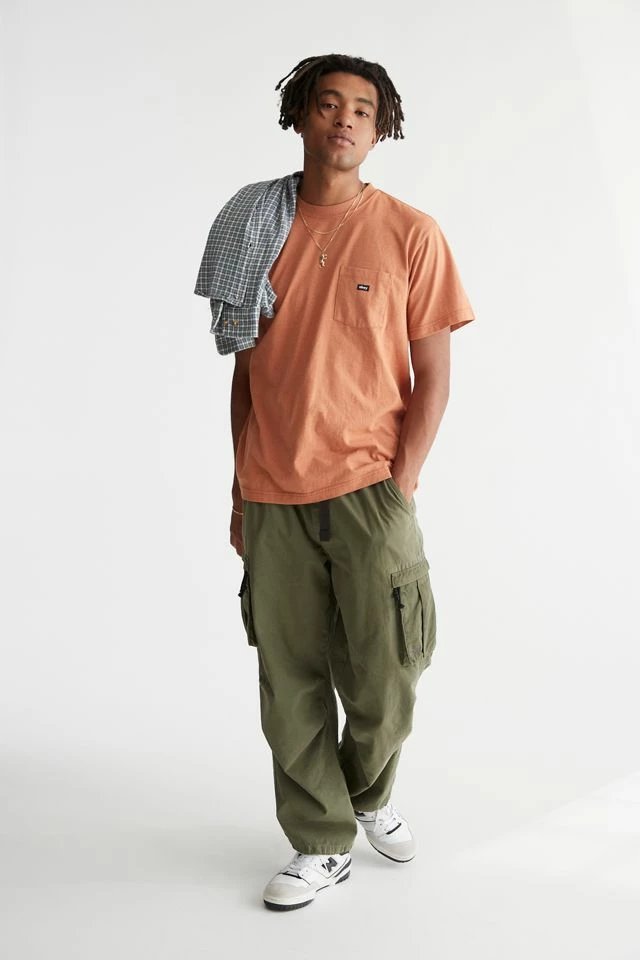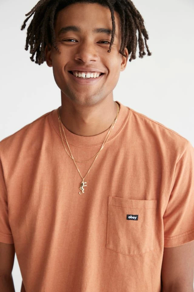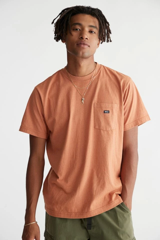 Tee by OBEY crafted using recycled materials. Standard fit t-shirt with a left chest pocket and ribbed knit crew neck.