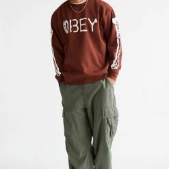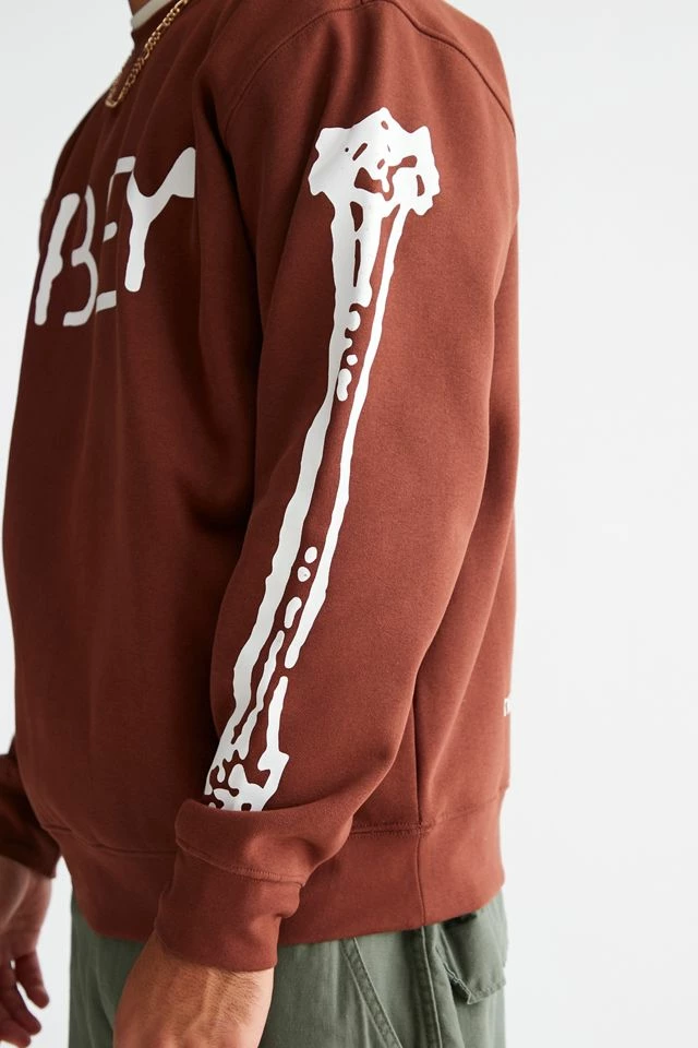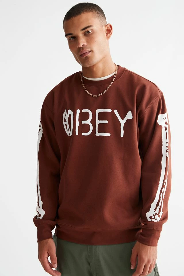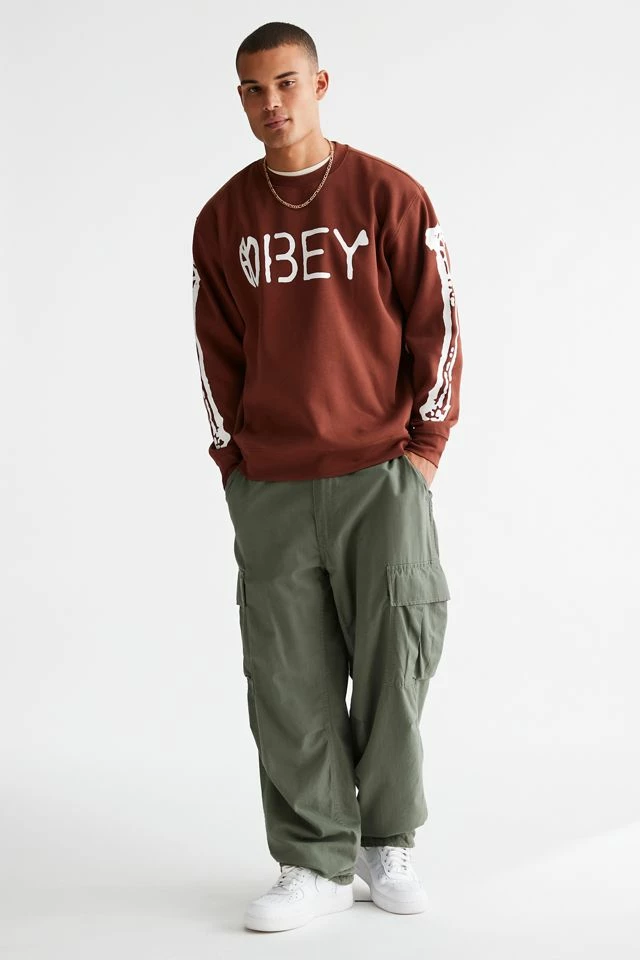 Pullover sweatshirt by OBEY topped with graphics allover. Crew neck style and fitted with ribbed knit trims. Urban Outfitters exclusive.