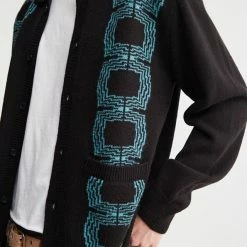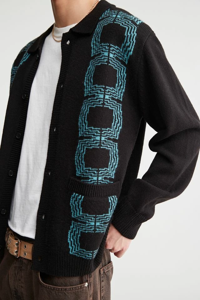 Knit cardigan by OBEY with a button-down front. Patterned sweater with ribbed knit trims.