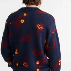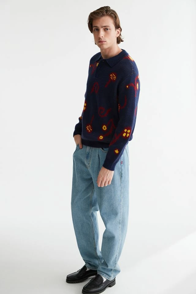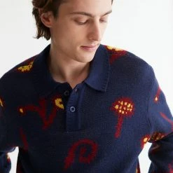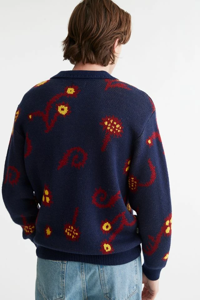 Pullover sweater by OBEY with an allover pattern. Knit fabrication with long sleeves and a polo style collar with partial button closure at the front. Fitted with ribbed knit trims.