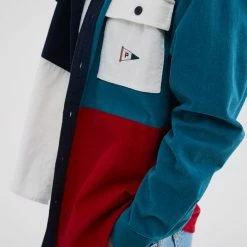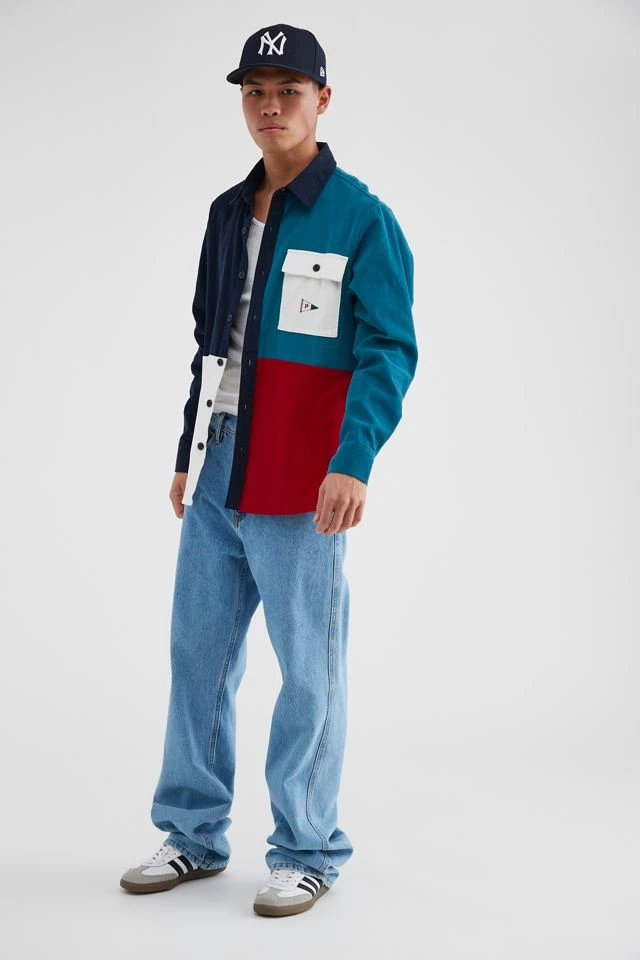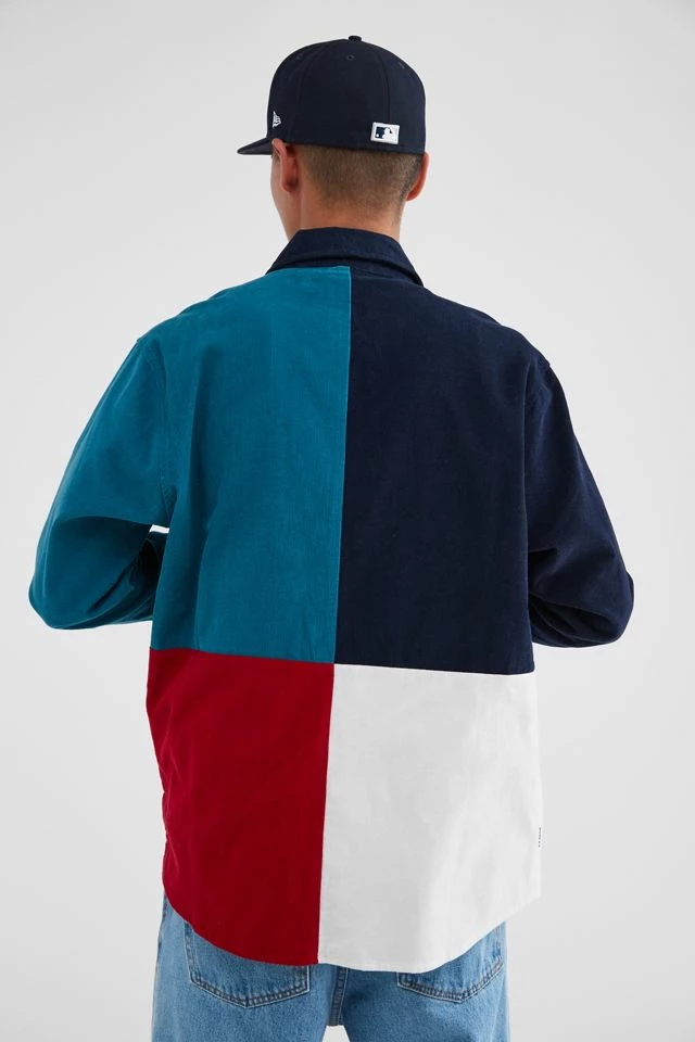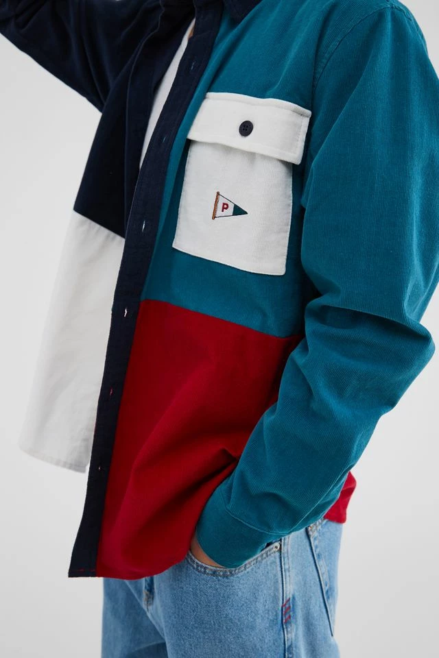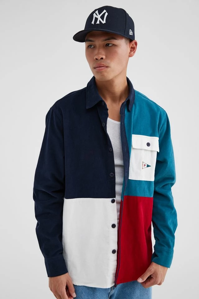 Button-down long sleeve shirt by Parlez with a patchwork corduroy fabrication. Fitted with a classic tab collar.