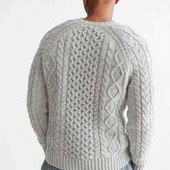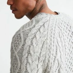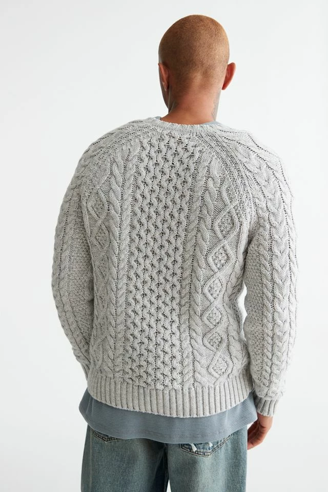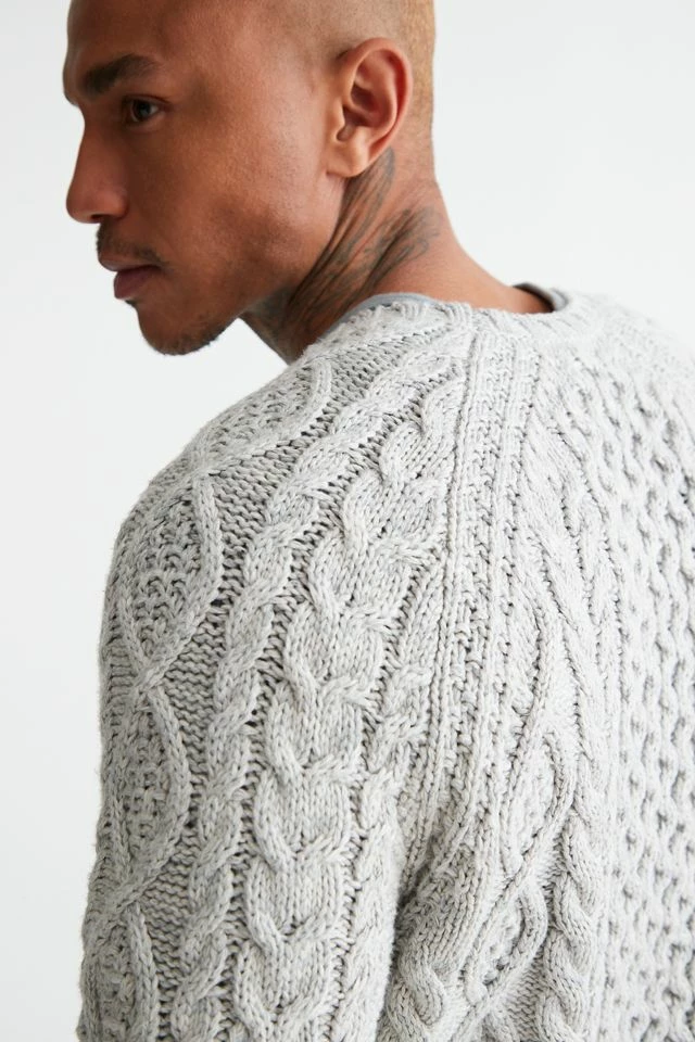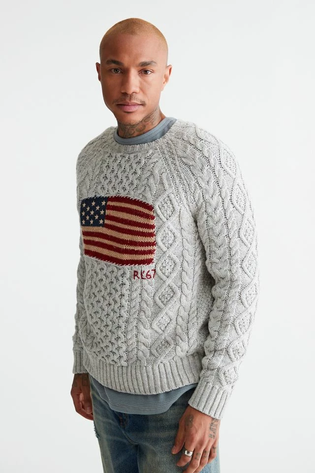 Cable knit sweater by Polo Ralph Lauren with a flag motif at the front. Crew neck pullover sweater finished with ribbed knit trims.