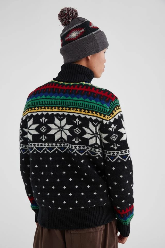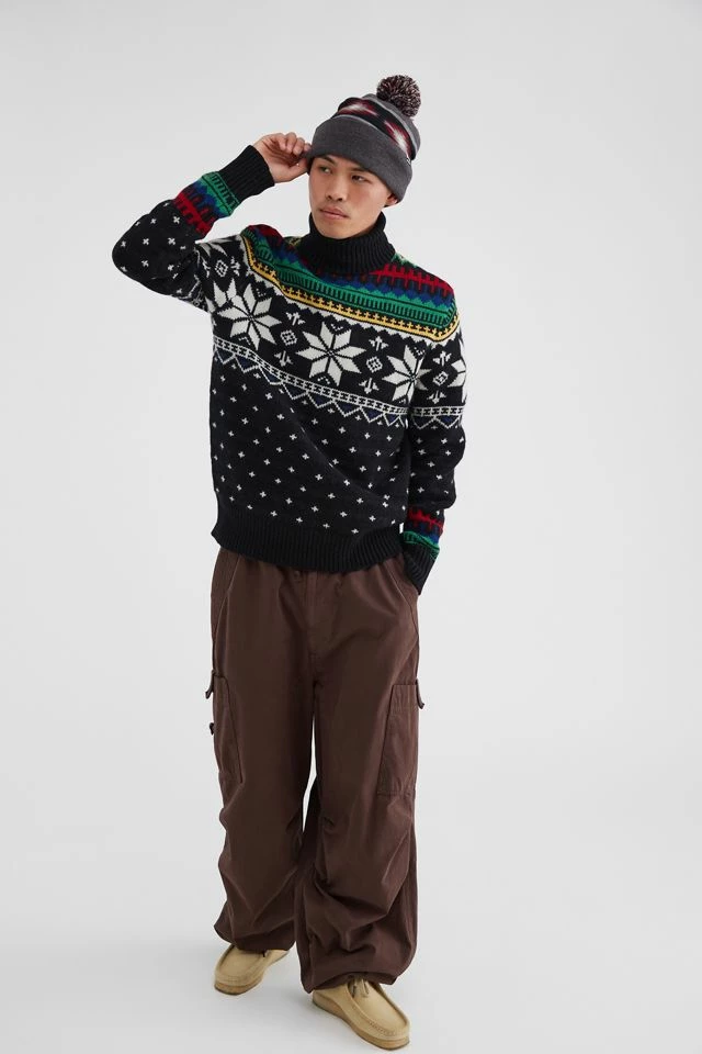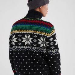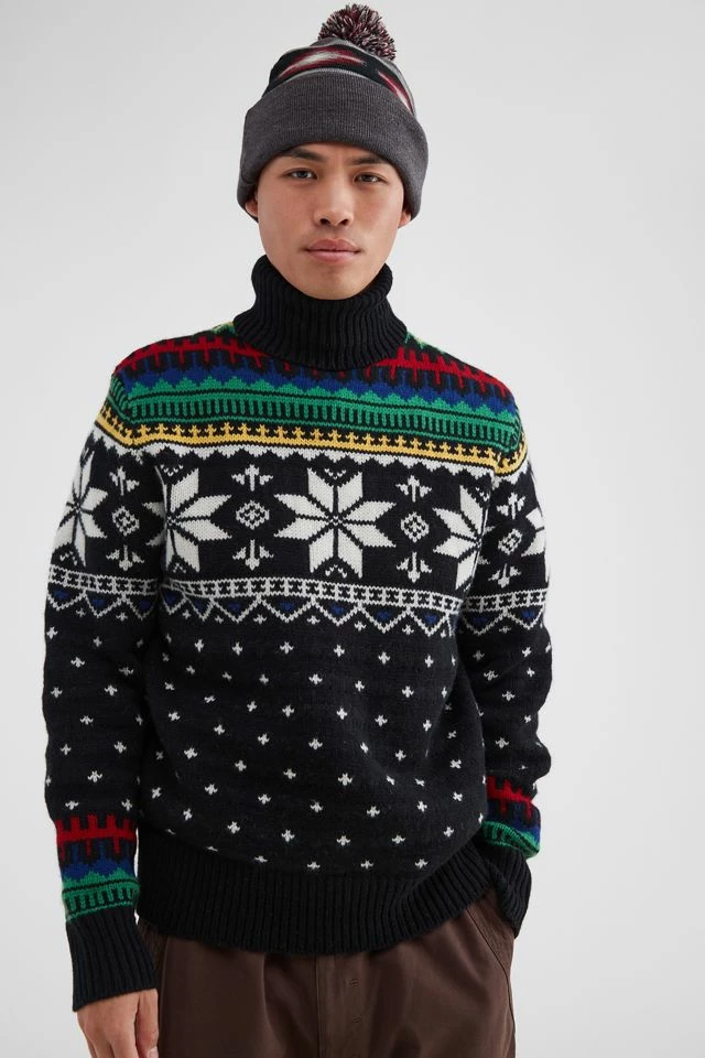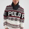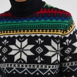 Patterned wool winter sweater by Polo Ralph Lauren. Pullover style in a knit fabrication. Fitted with a turtleneck and ribbed knit trims.