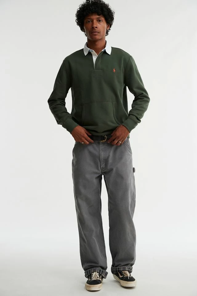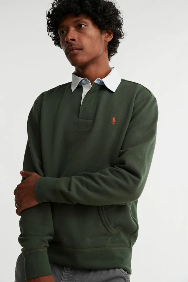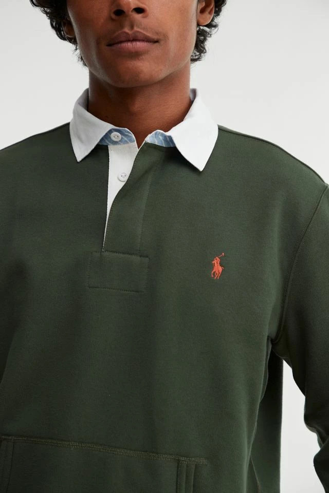 Pullover rugby style sweatshirt by Polo Ralph Lauren with a contrast polo tab collar. Topped with a logo accent at the left chest. Fitted with a pouch pocket & complete with ribbed knit trims.