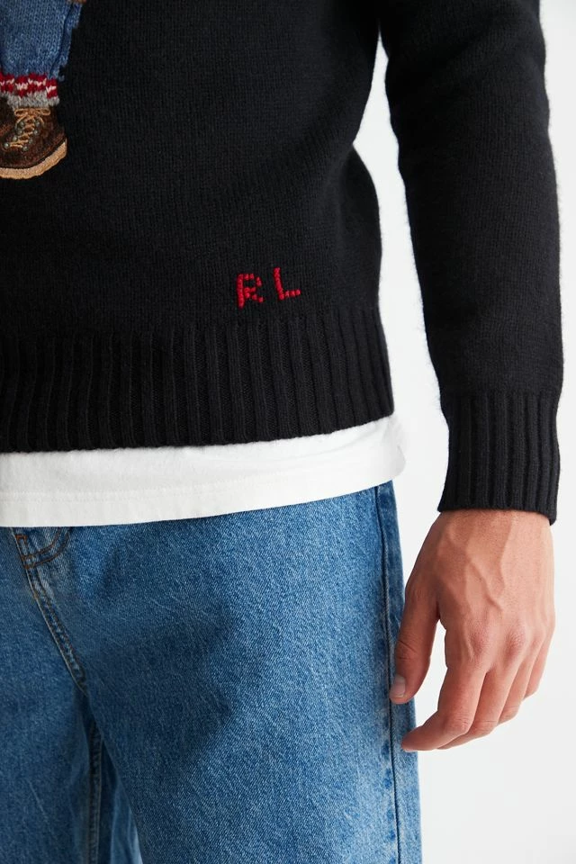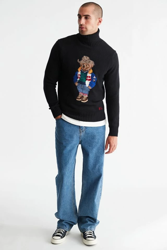 Pullover turtleneck sweater by Polo Ralph Lauren. Wool knit with a bear motif at the front. Fitted with ribbed knit trims.