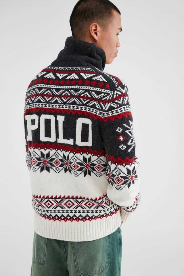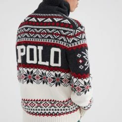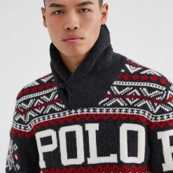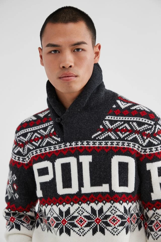 Shawl neck sweater by Polo Ralph Lauren. Knit fabrication with an allover pattern. Pullover style with a button detail at the neck and ribbed knit trims.