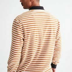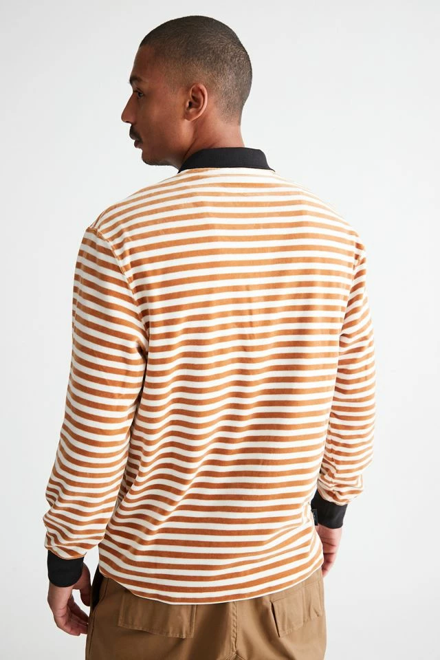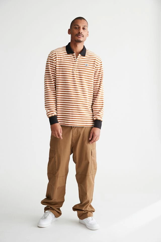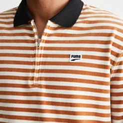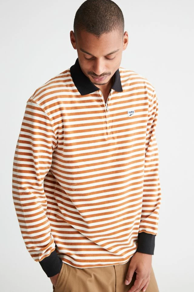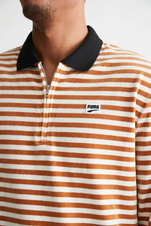 Velour polo collar shirt by Puma with an allover stripe pattern. Partial zip style with contrast collar and cuffs. Topped with a logo at the left chest.