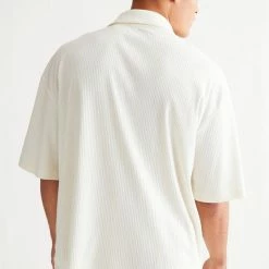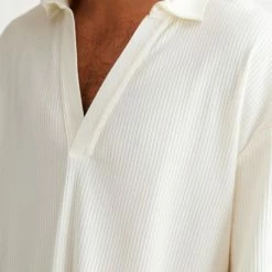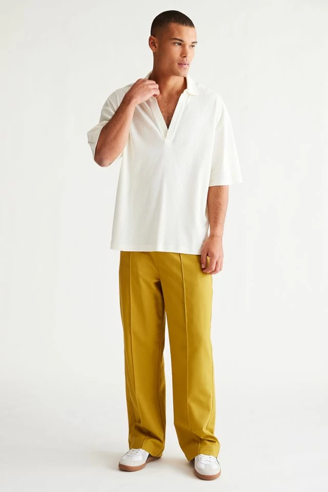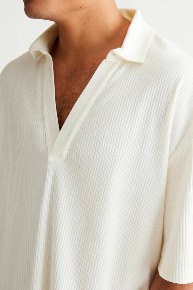 Loose ribbed knit polo shirt from Standard Cloth. Cut in a boxy oversized fit with an open v-neck with tab collar. Finished with dropped short sleeves. Urban Outfitters exclusive.