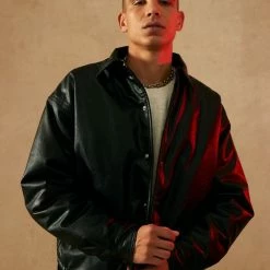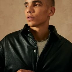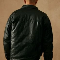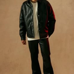Faux leather shirt jacket by Standard Cloth. Filled shirt with a button closure front and fitted with a tab collar. Urban Outfitters exclusive.