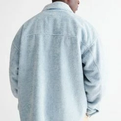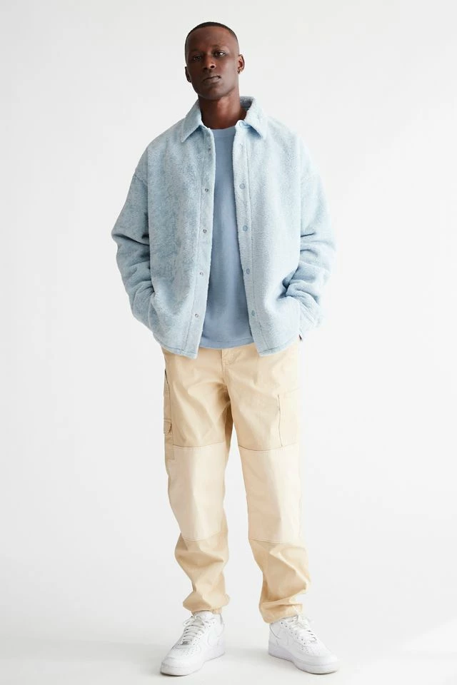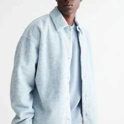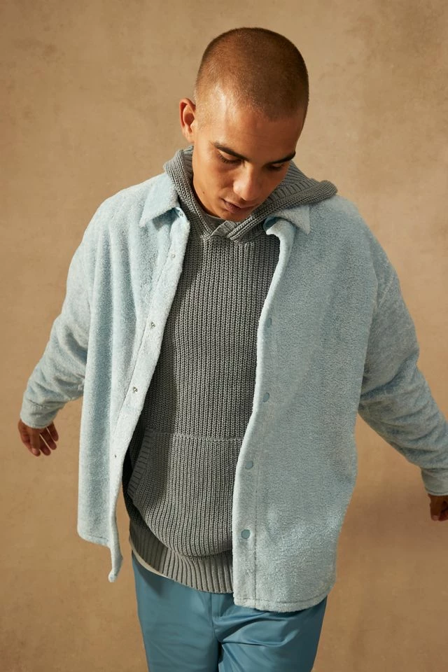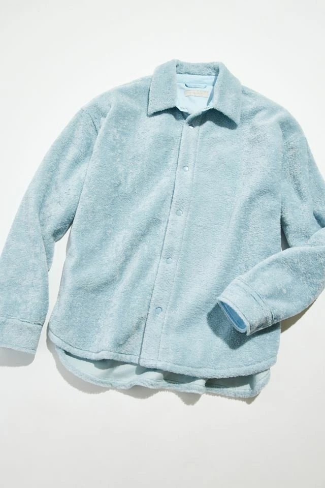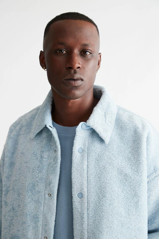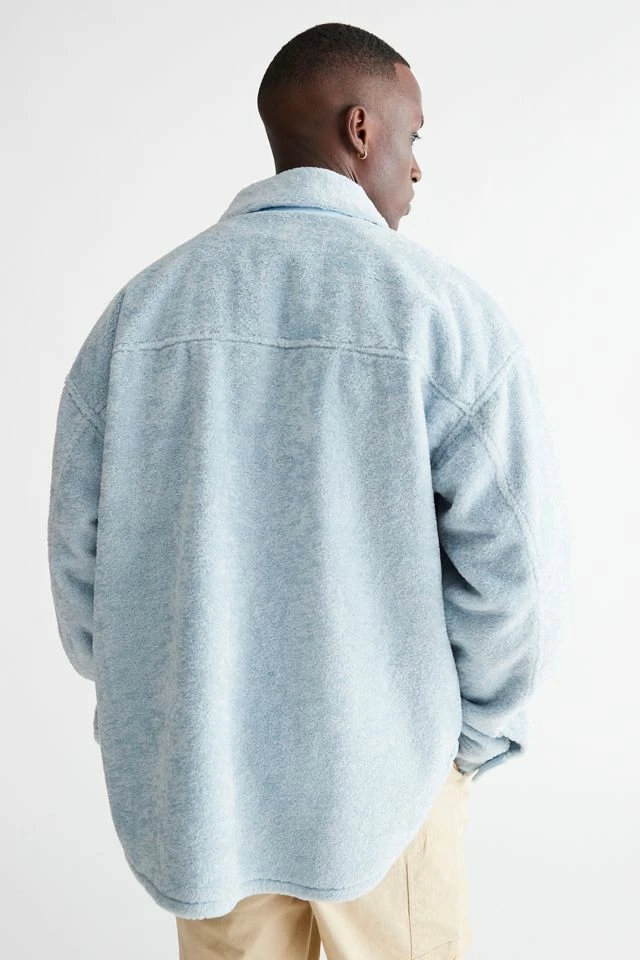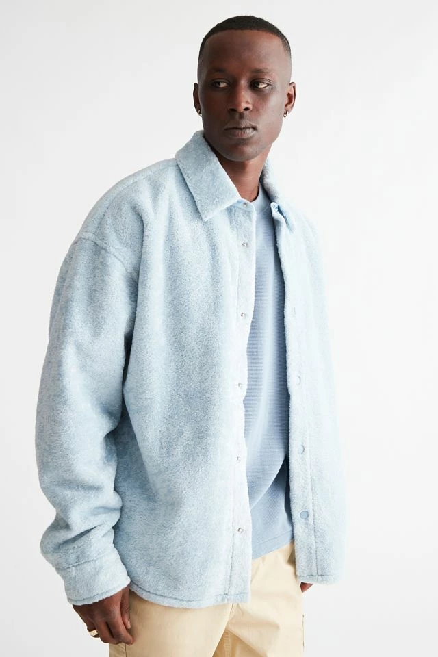 Oversized fit shirt jacket by Standard Cloth. Plush fabrication with a snap closure front and tab collar. Urban Outfitters exclusive.