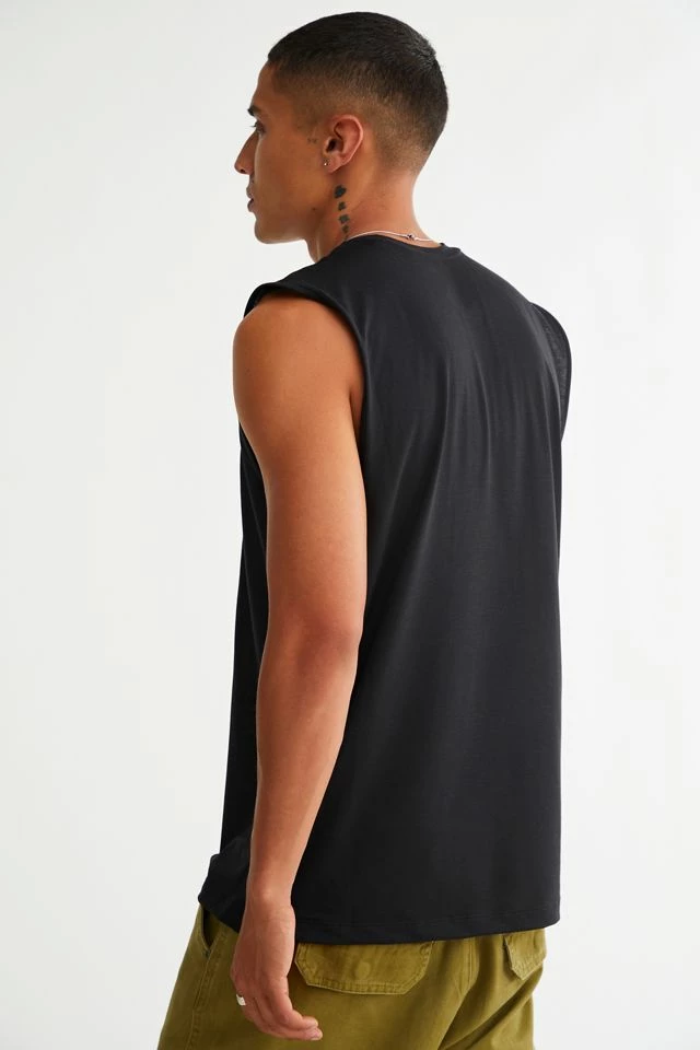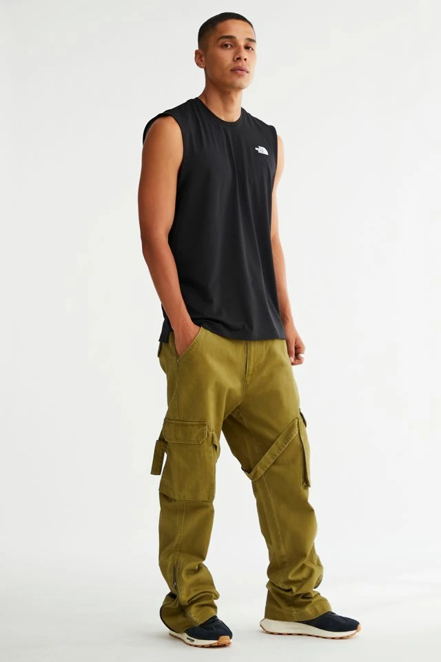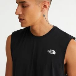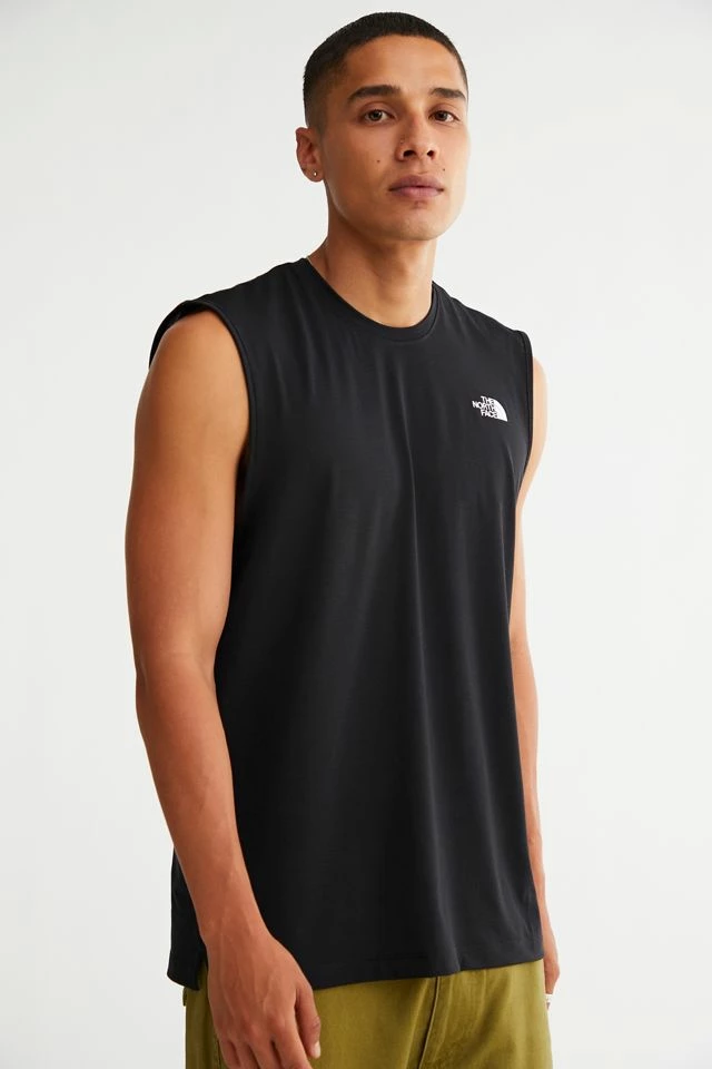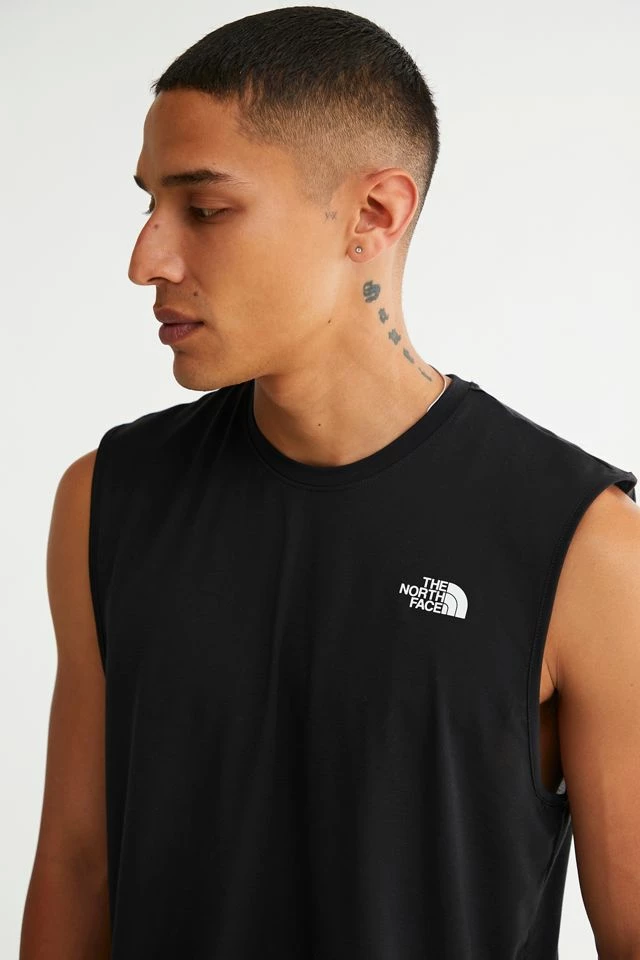 Standard-fit sleeveless tee from The North Face in their moisture-wicking FlashDry knit to help keep you cool and dry. Slight stretch fit with a side-vented seam and heat-transfer logo. Made from 94% recycled materials.
