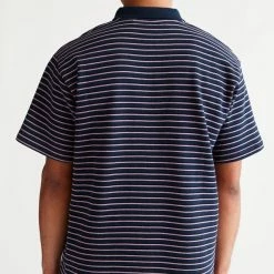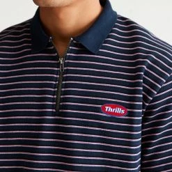 Allover stripe pattern shirt by THRILLS. Relaxed & baggy fit short sleeve shirt with a partial zip closure at the front. Topped with a logo at the left chest. Fitted with a tab collar.