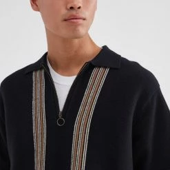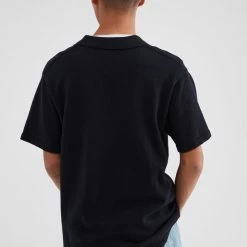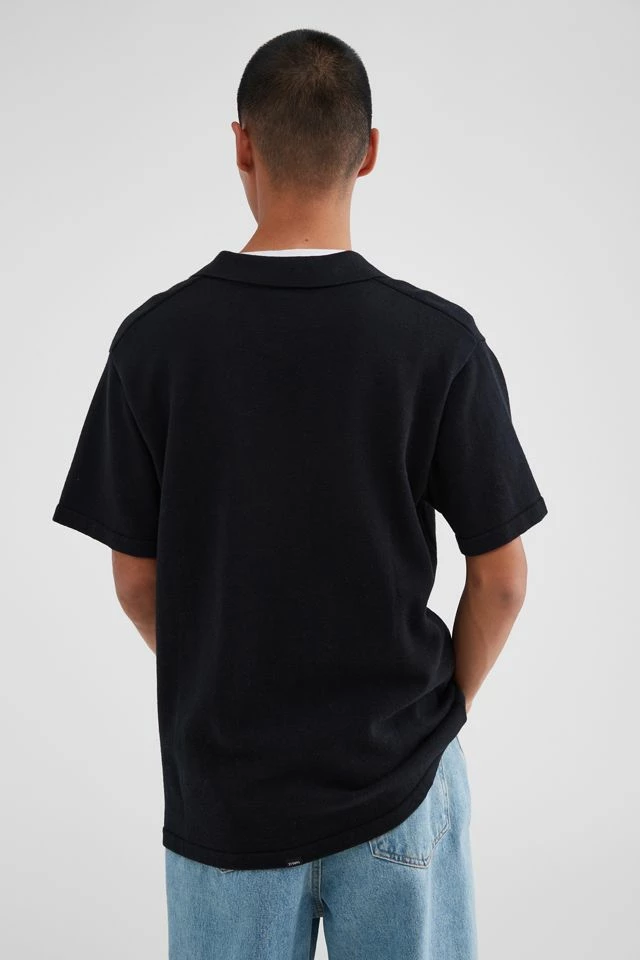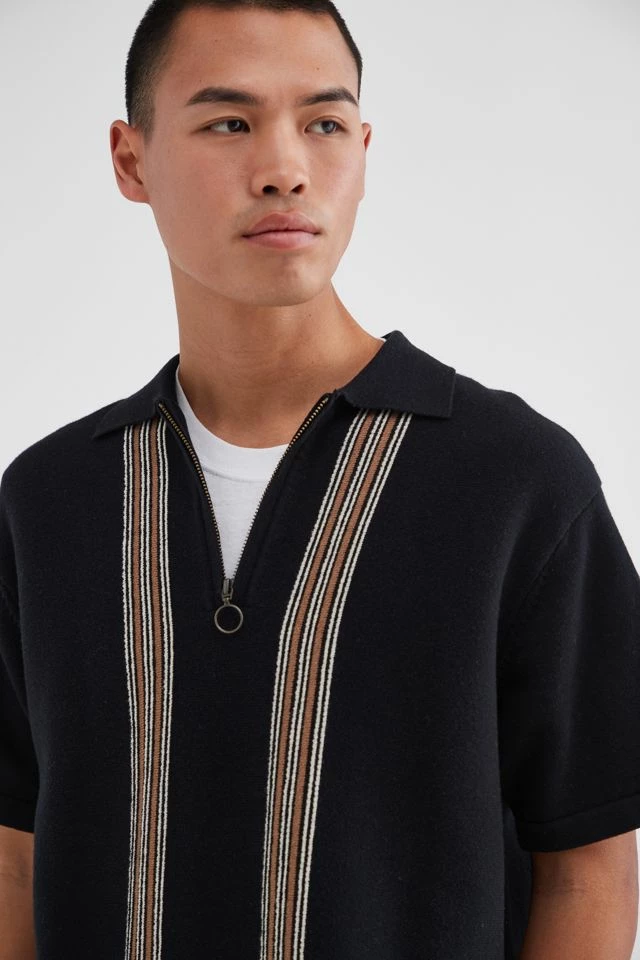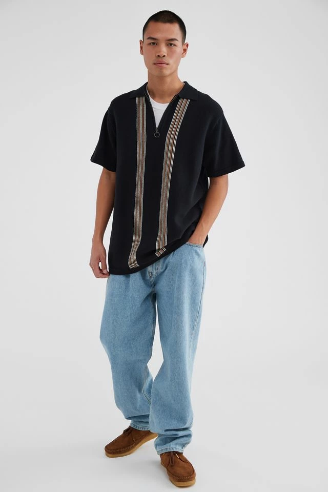Relaxed fit polo style shirt by THRILLS. Topped with stripe detailing at the front. Short sleeve style with a button closure front.