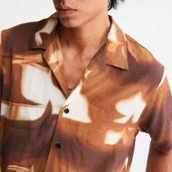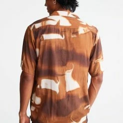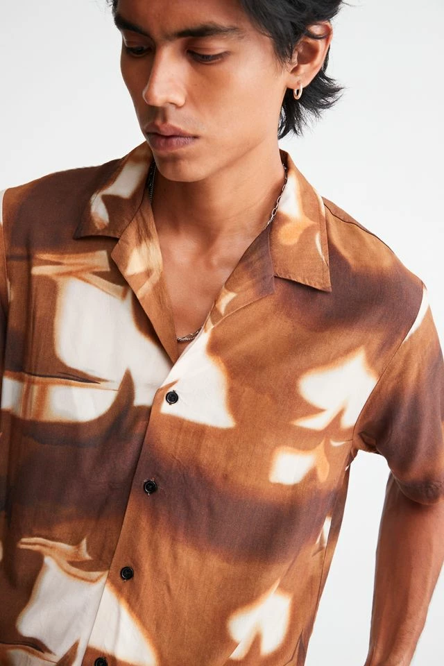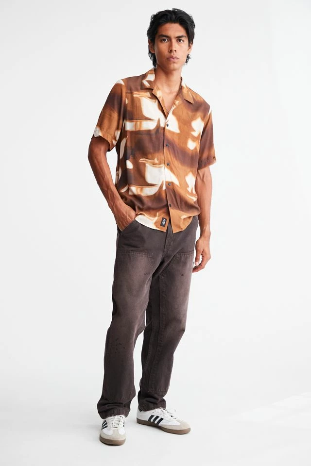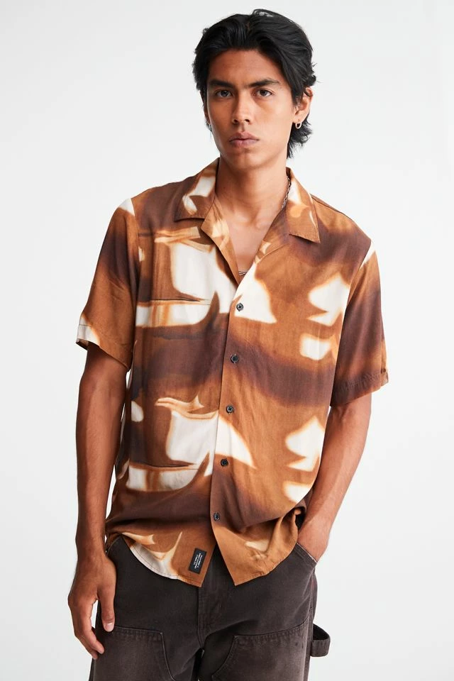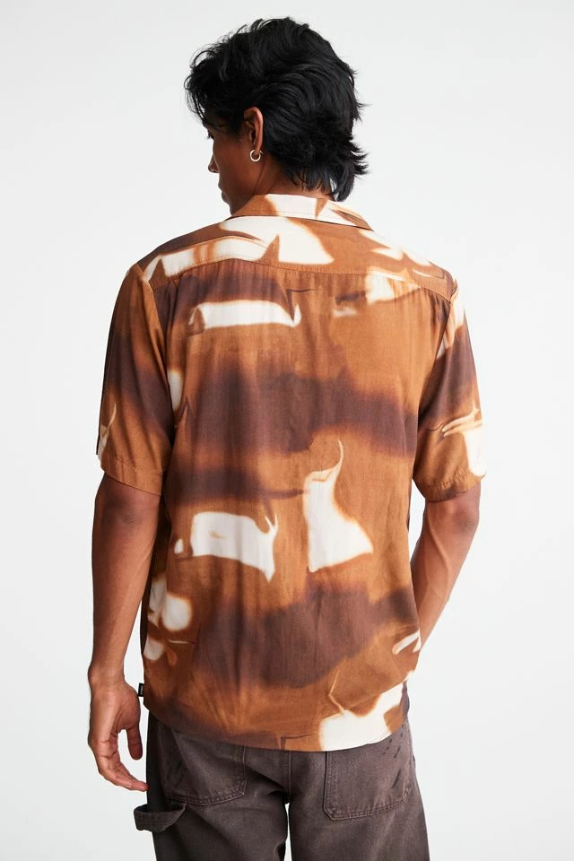 Button-down bowling shirt by THRILLS with an allover pattern. Short sleeve style with a notched tab collar.
