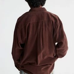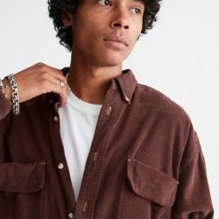 Overdyed cotton cord shirt by Urban Renewal. Long sleeve shirt with a button-down front and tab collar. This modern design shirt was created by Urban Renewal from unique vintage and deadstock items found around the world. Though similar in style to what you see here, each upcycled item is one-of-a-kind and may vary from piece to piece.