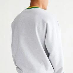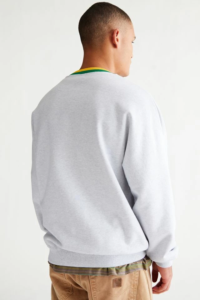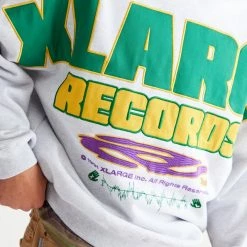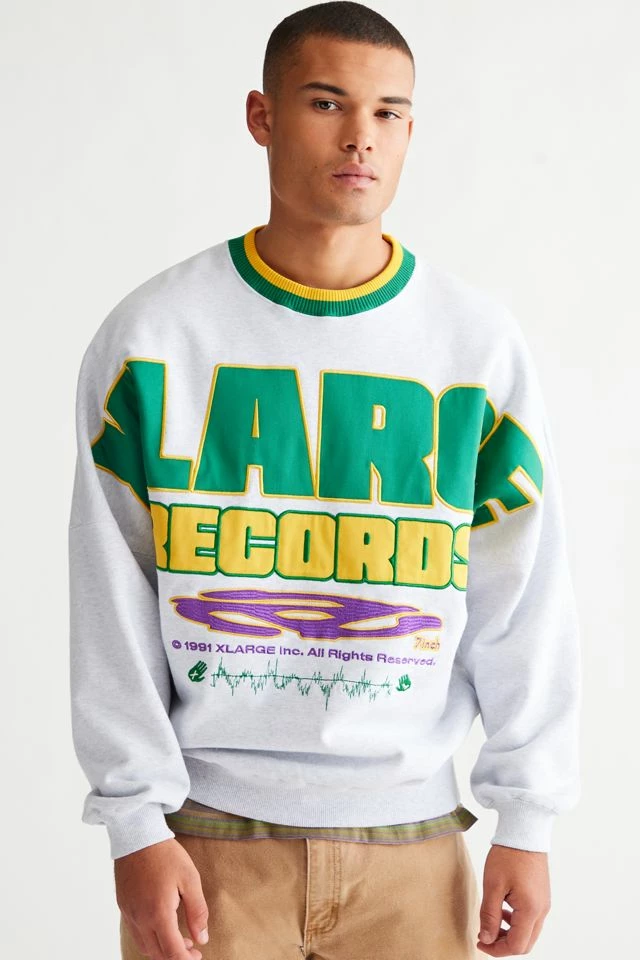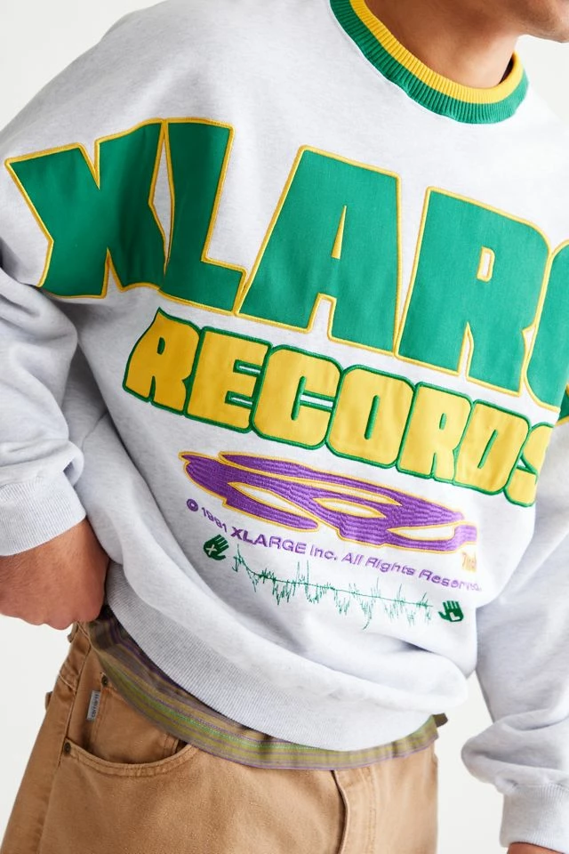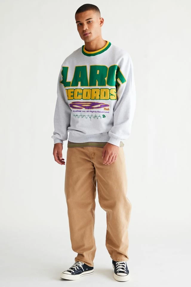 Oversized fit pullover crew neck sweatshirt by XLARGE with bold logo graphics. Fitted with striped ribbing trim at the crew neck.