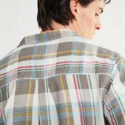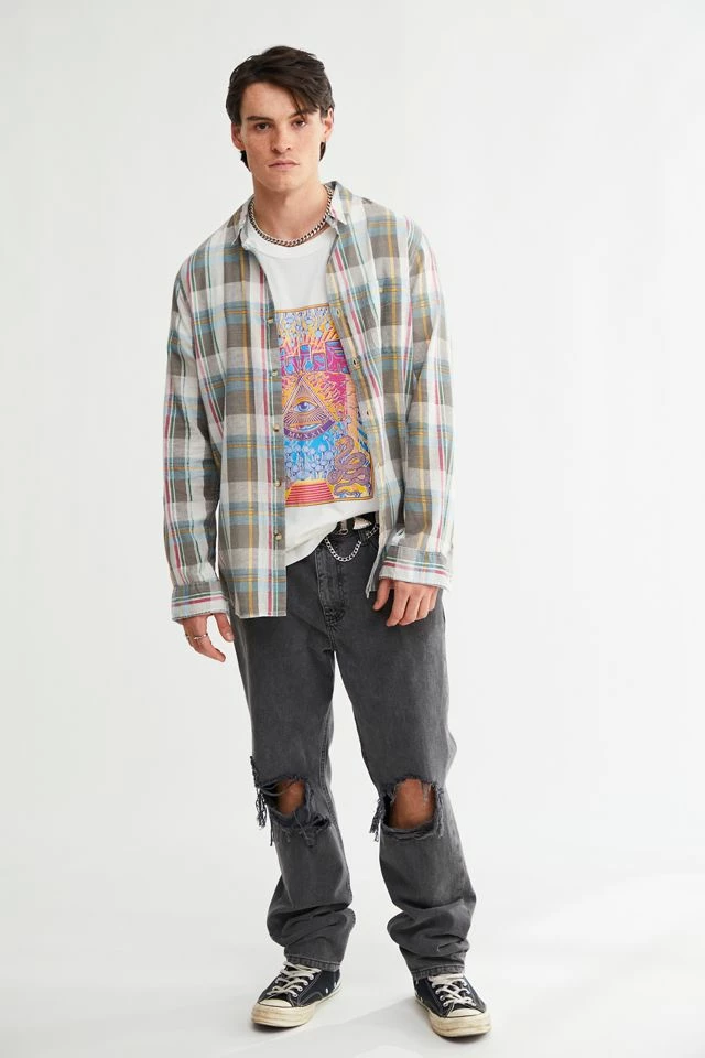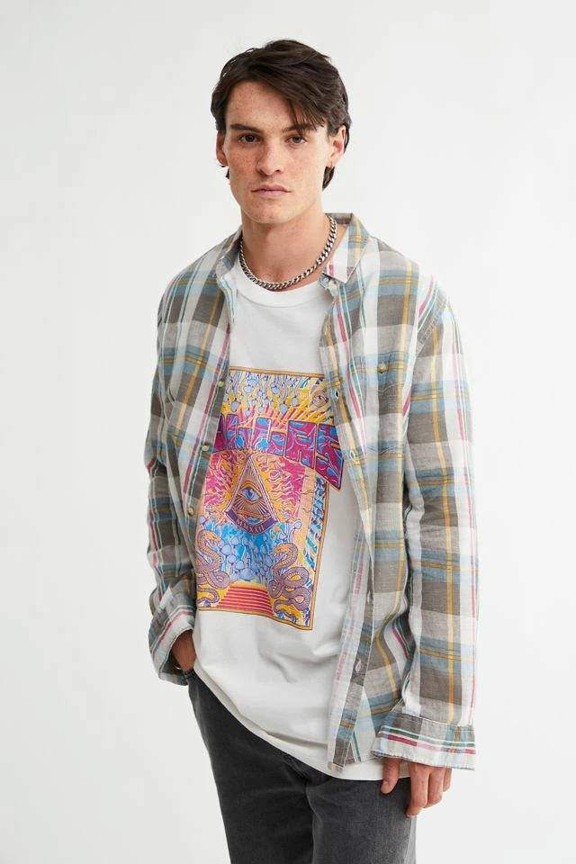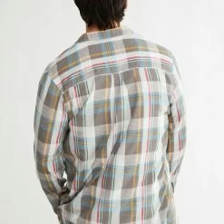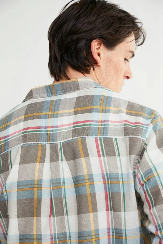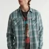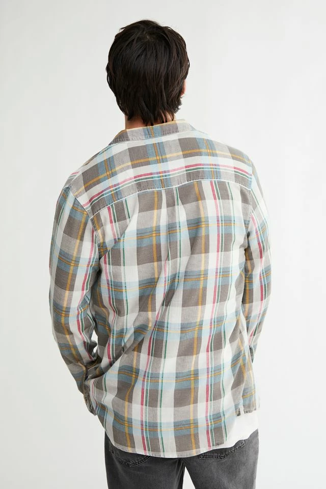 Long sleeve shirt by Rolla’s with an allover plaid pattern. Heavyweight cotton overshirt with a button-down front & tab collar.