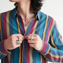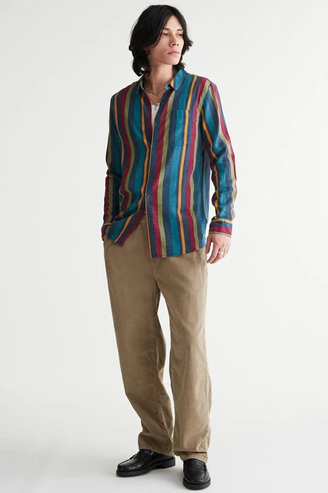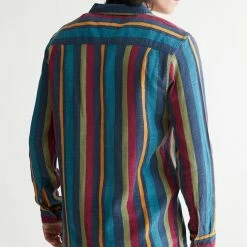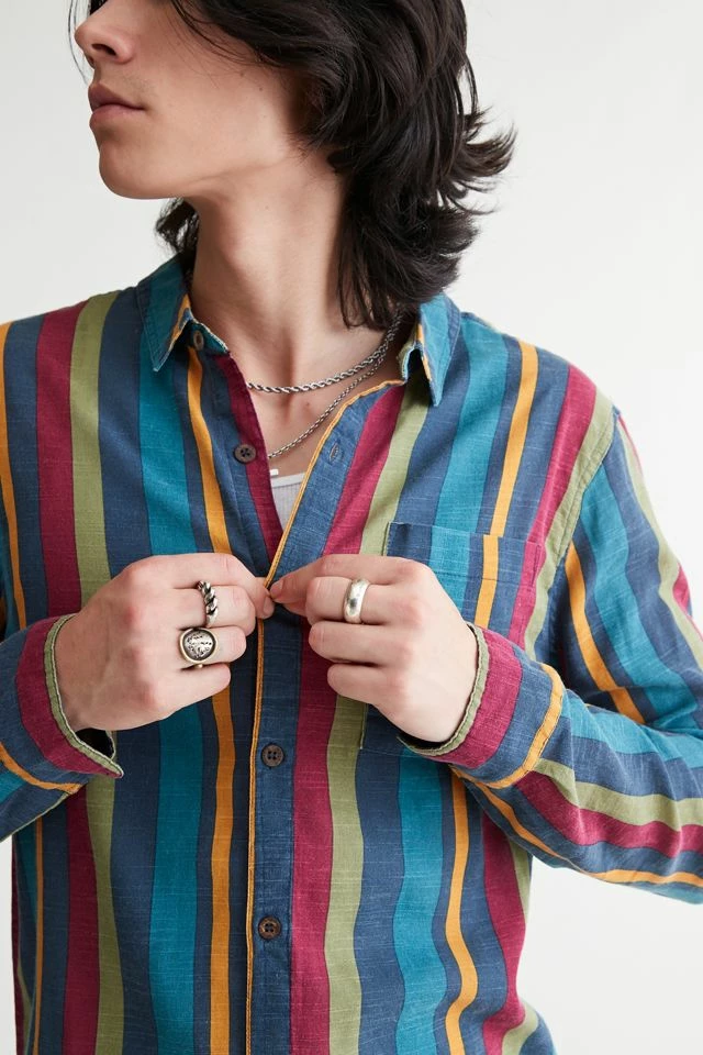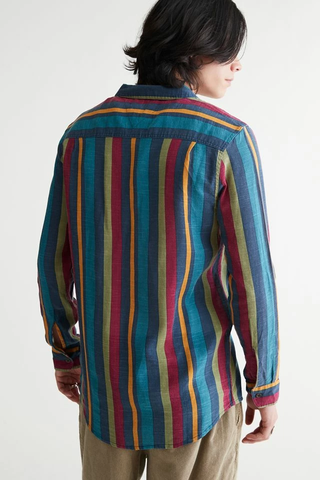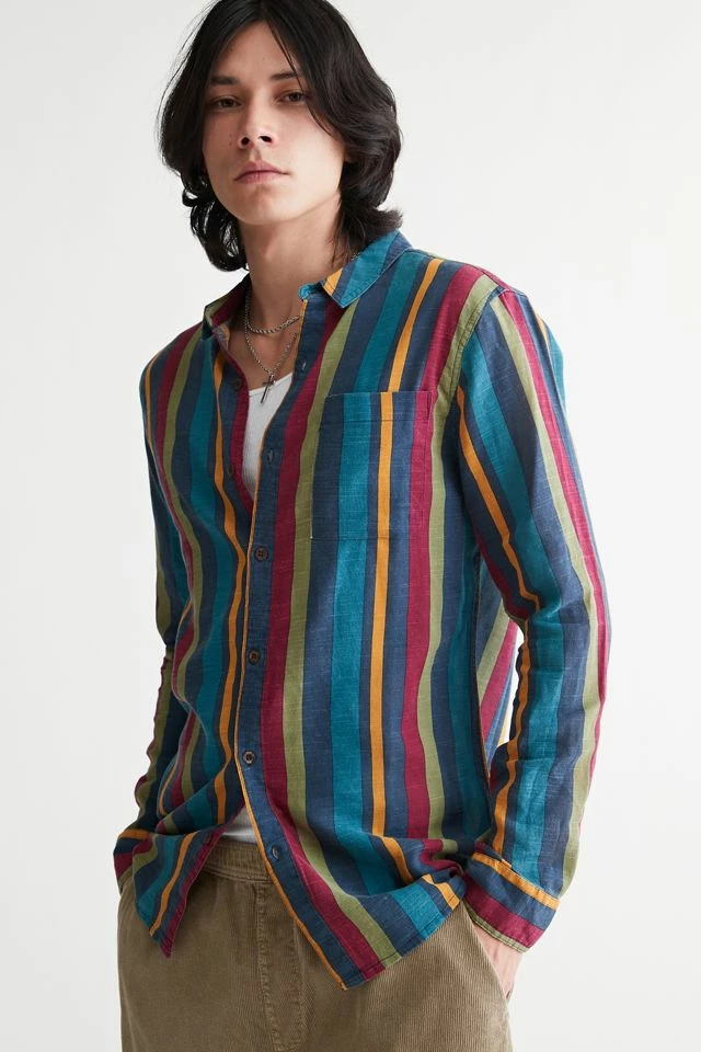 Allover stripe pattern shirt by Rolla’s. Cotton shirt with long sleeves and a button-down front. Fitted with a foldover tab collar.