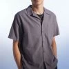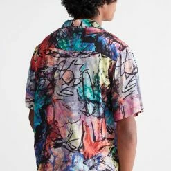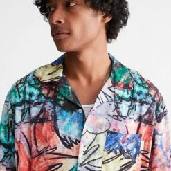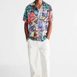 Patterned rayon shirt by Urban Outfitters with a button-down front. Short sleeve shirt cut in a slightly relaxed fit with a tab collar.
