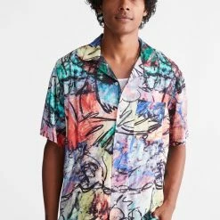 Patterned rayon shirt by Urban Outfitters with a button-down front. Short sleeve shirt cut in a slightly relaxed fit with a tab collar.