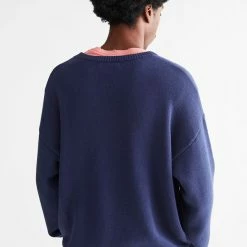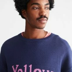 Crew neck sweater with text at the front. Pullover knit style finished with ribbed knit trims.
