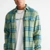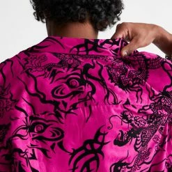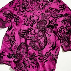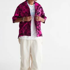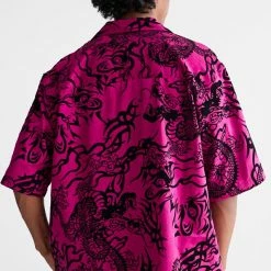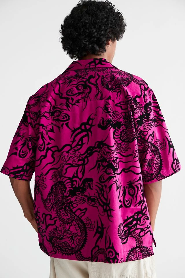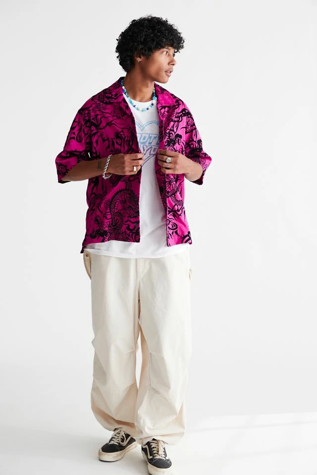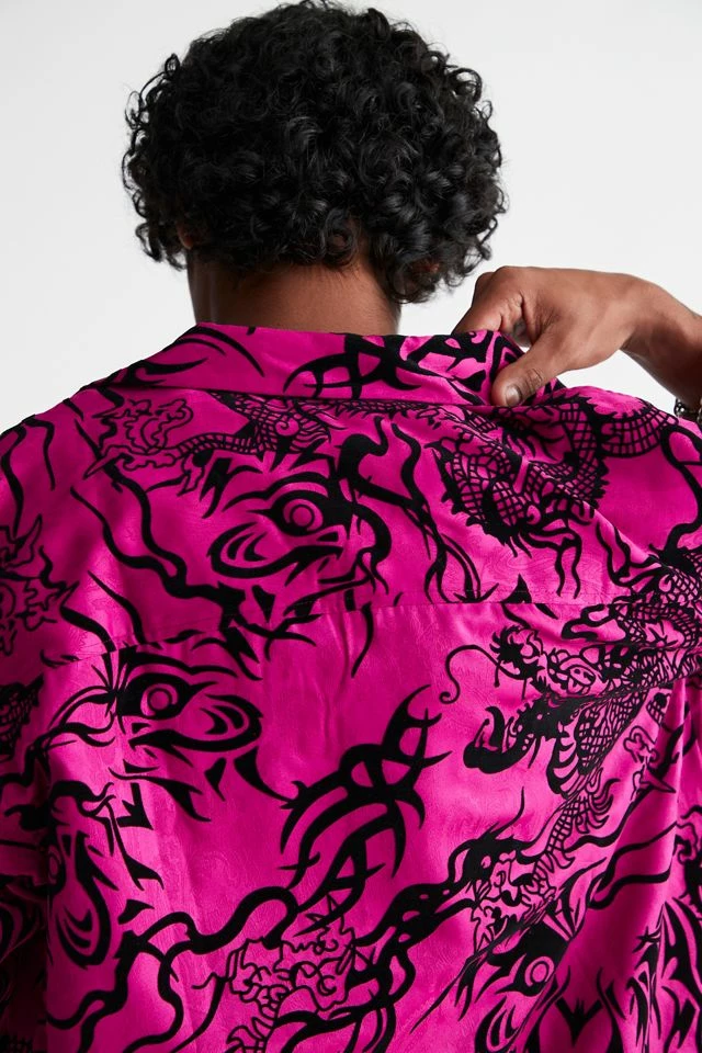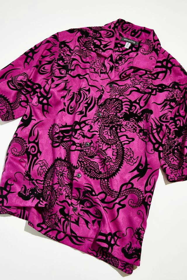 Allover pattern satin shirt by Urban Outfitters in a relaxed fit. Features a smocked print allover. Short sleeve style with a button-down front and a tab collar.